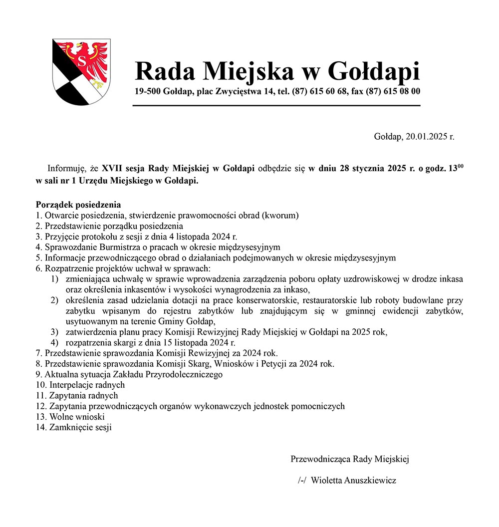 Posiedzenie rozpocznie się o 13:00. W programie m.in. aktualna sytuacja zakładu przyrodoleczniczego. Niżej program oraz link do transmisji i retransmisji: https://esesja.tv/transmisje_z_obrad/654/rada-miejska-w-goldapi.htm