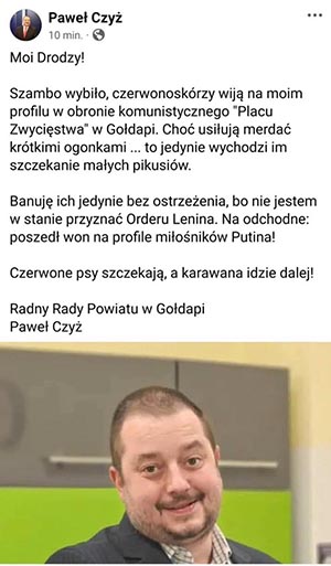 Szambo wybiło, czerwonoskórzy wiją na moim profilu w obronie komunistycznego „Placu Zwycięstwa” w Gołdapi. Choć usiłują merdać krótkimi ogonkami … to jedynie wychodzi im szczekanie małych pikusiów.