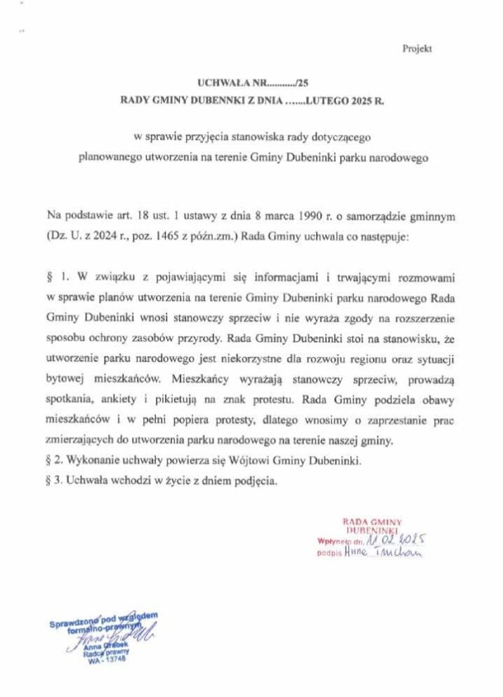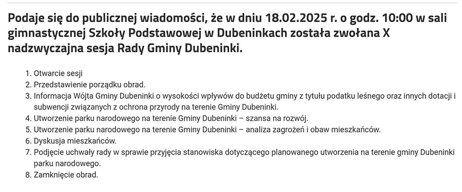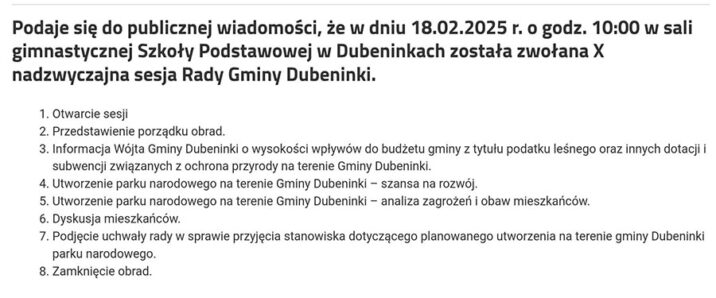 Sesja nadzwyczajna Rady Gminy Dubeninki co prawda dopiero za kilka dni (18 lutego), ale jest już projekt uchwały przeciwko utworzeniu parku narodowego na terenie Puszczy Rominckiej. Dziś (14 lutego) odbyło się posiedzenie komisji stałej Rady i radni jednogłośnie zaakceptowali tę propozycję.