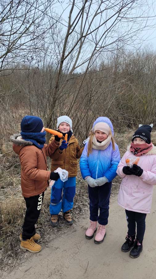 Przedszkolaki rozpoczęły swoje działania od rozwieszenia jedzenia dla ptaków w karmnikach znajdujących się w szkolnym ogrodzie. Następnie, wyposażone w zapasy dla leśnych zwierząt, wyruszyły na krótki spacer, aby zostawić przysmaki w wyznaczonych miejscach. Podczas tej wyprawy miały okazję na własnej skórze poczuć, jak niskie temperatury utrudniają życie dzikim zwierzętom zimą.