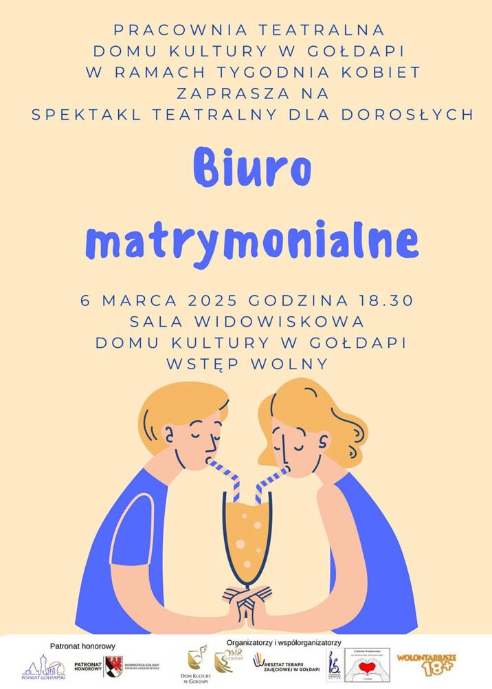 Spektakl teatralny dla dorosłych – „Biuro matrymonialne”. Uczestnicy pracowni teatralnej Domu Kultury pod kierunkiem Katarzyny Miernik przedstawią spektakl, obfitujący w zabawne dialogi i błyskotliwe obserwacje dotyczące relacji międzyludzkich.