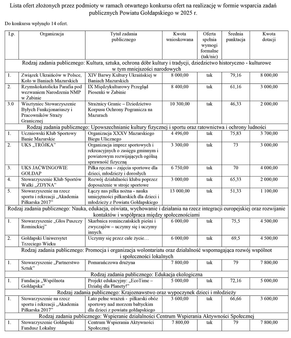 W załączeniu „Lista ofert złożonych przez podmioty w ramach otwartego konkursu ofert na realizację w formie wsparcia zadań publicznych Powiatu Gołdapskiego w 2025 r.”.