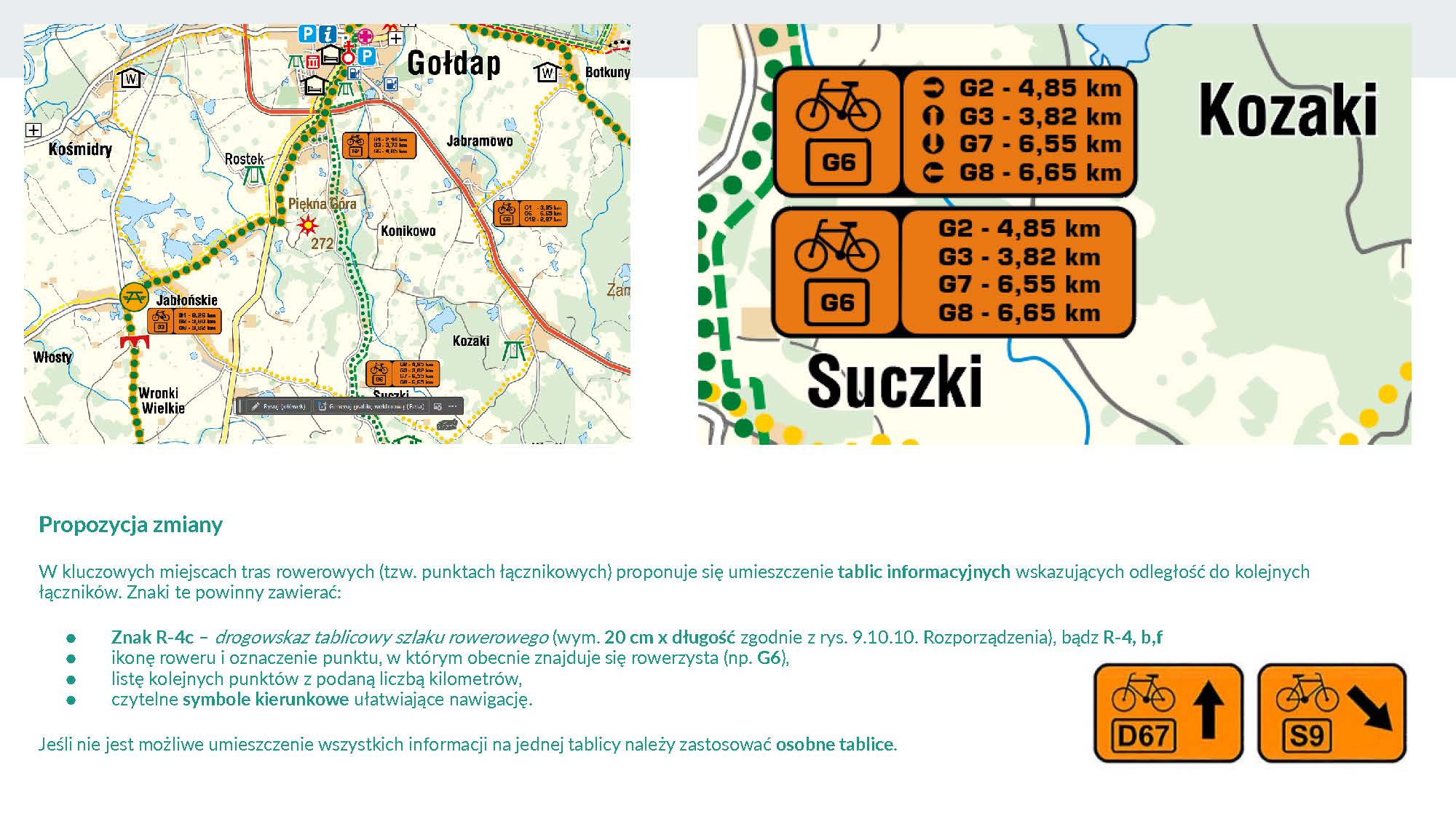 Czyżby znaki miały być umieszczane na złotych rurach, albo też będzie ich „zatrzęsienie”. Wszak rowerzysta nie potrzebuje wielu znaków przebiegu trasy na długich odcinkach bez skrzyżowań i ostrych zakrętów (a takich odcinków na planowanym szlaku jest niemało). Taka jest zasada. Na terenach leśnych większa część znaków przebiegu tras znajduje się m.in. na pniach drzew.