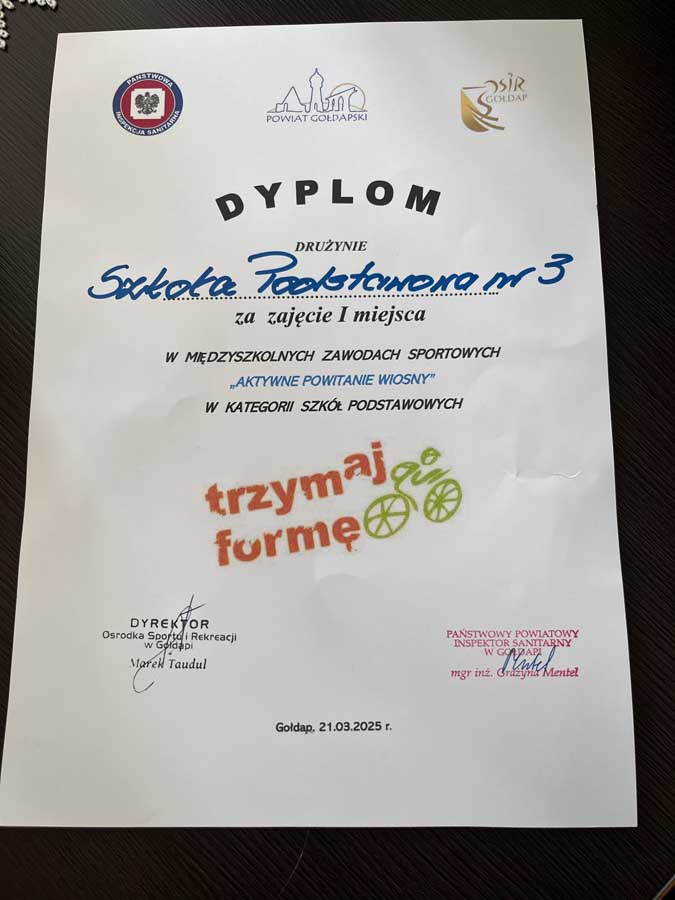 W piątek drużyna z gołdapskiej SP3 Gołdap uczestniczyła (i zajęła I miejsce) w Międzyszkolnych Zawodach Sportowych „Aktywne Powitanie Wiosny”, zorganizowanych w ramach realizacji ogólnopolskiego programu edukacyjnego „Trzymaj Formę”.