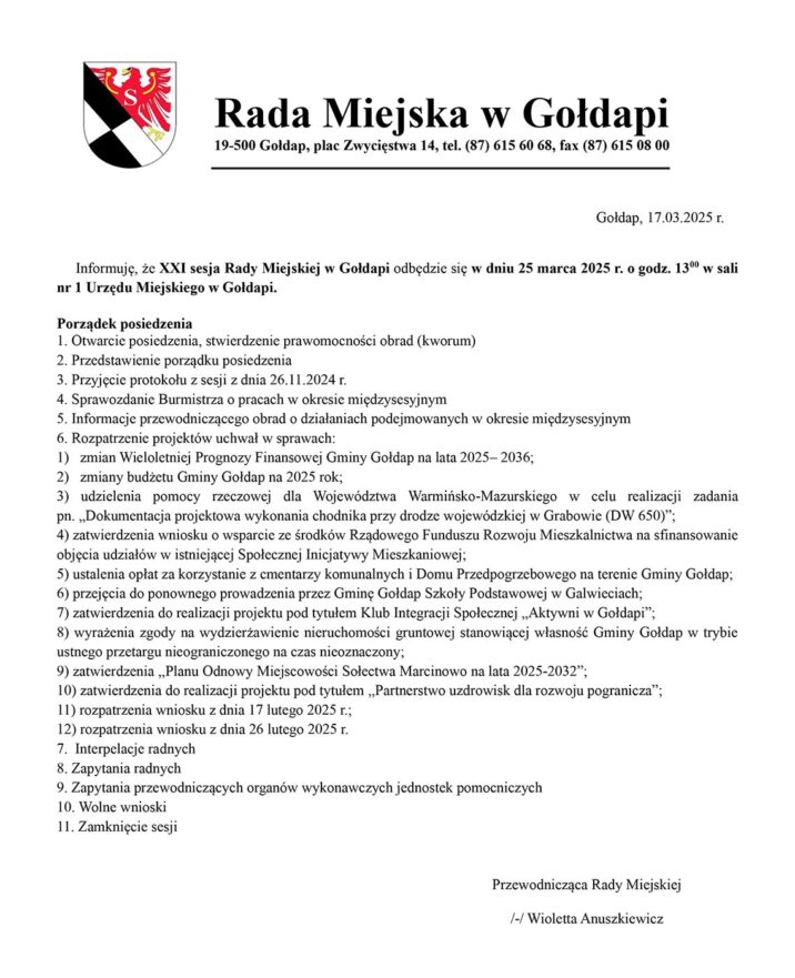 Posiedzenie rozpocznie się o 13:00. Jednym z punktów sesji będzie głosowanie nad uchwałą dotyczącą przekazania Szkoły Podstawowej w Galwieciach pod ponowny zarząd Gminy Gołdap. Przypomnijmy, że od 2014 roku szkoła ta była prowadzona przez Fundację Rozwoju Regionu Gołdap. Niżej program posiedzenia oraz link do transmisji i retransmisji: https://esesja.tv/transmisje_z_obrad/654/rada-miejska-w-goldapi.htm