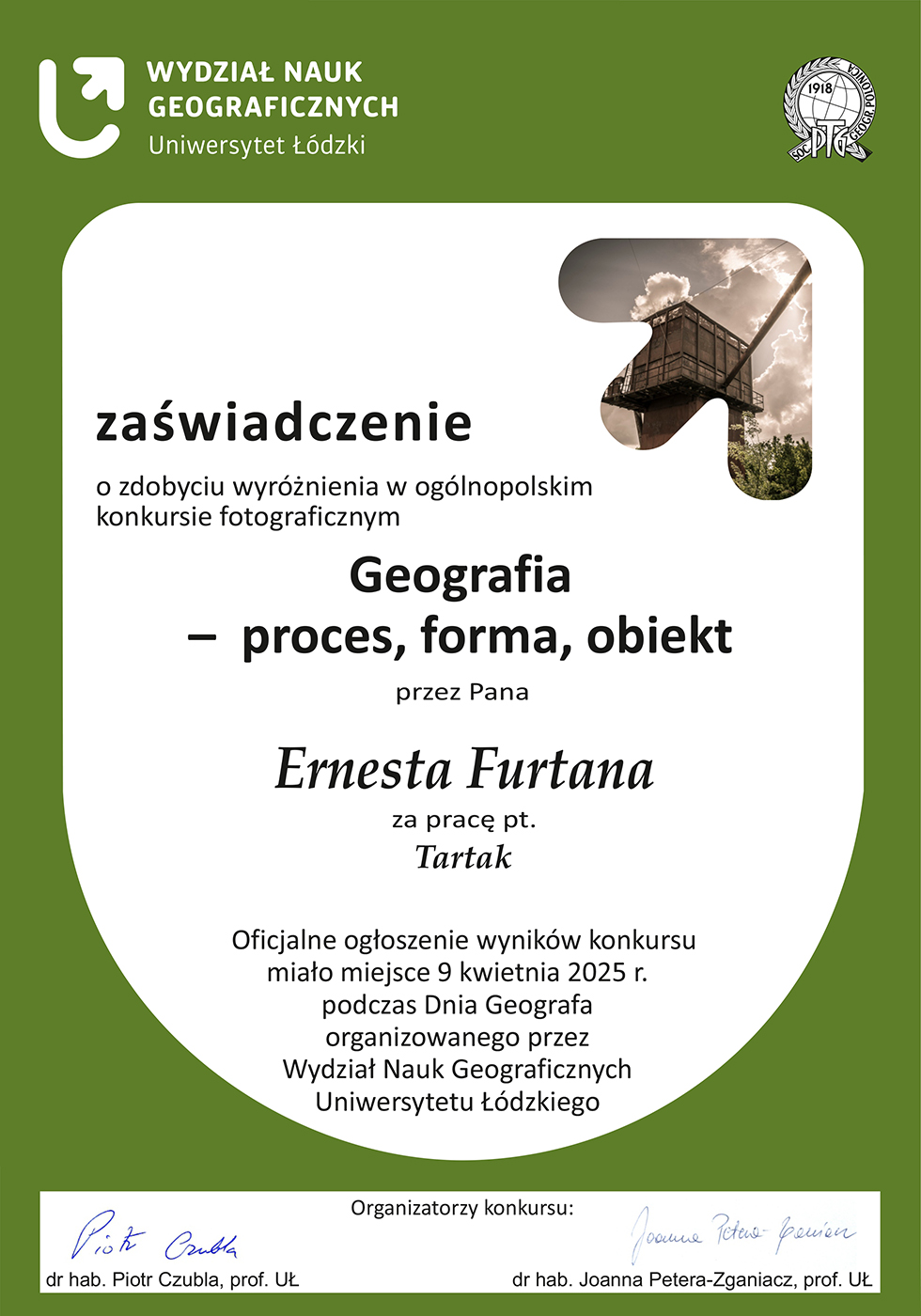 Konkurs został zorganizowany przez Wydział Nauk Geograficznych Uniwersytetu Łódzkiego i miał na celu ukazanie przestrzeni geograficznej w nieoczywisty, twórczy sposób – jako wynik procesów, przemian i ludzkiej ingerencji. Praca Ernesta doskonale wpisała się w tę ideę, łącząc wrażliwość artystyczną z dokumentalnym spojrzeniem na otaczającą nas rzeczywistość.
