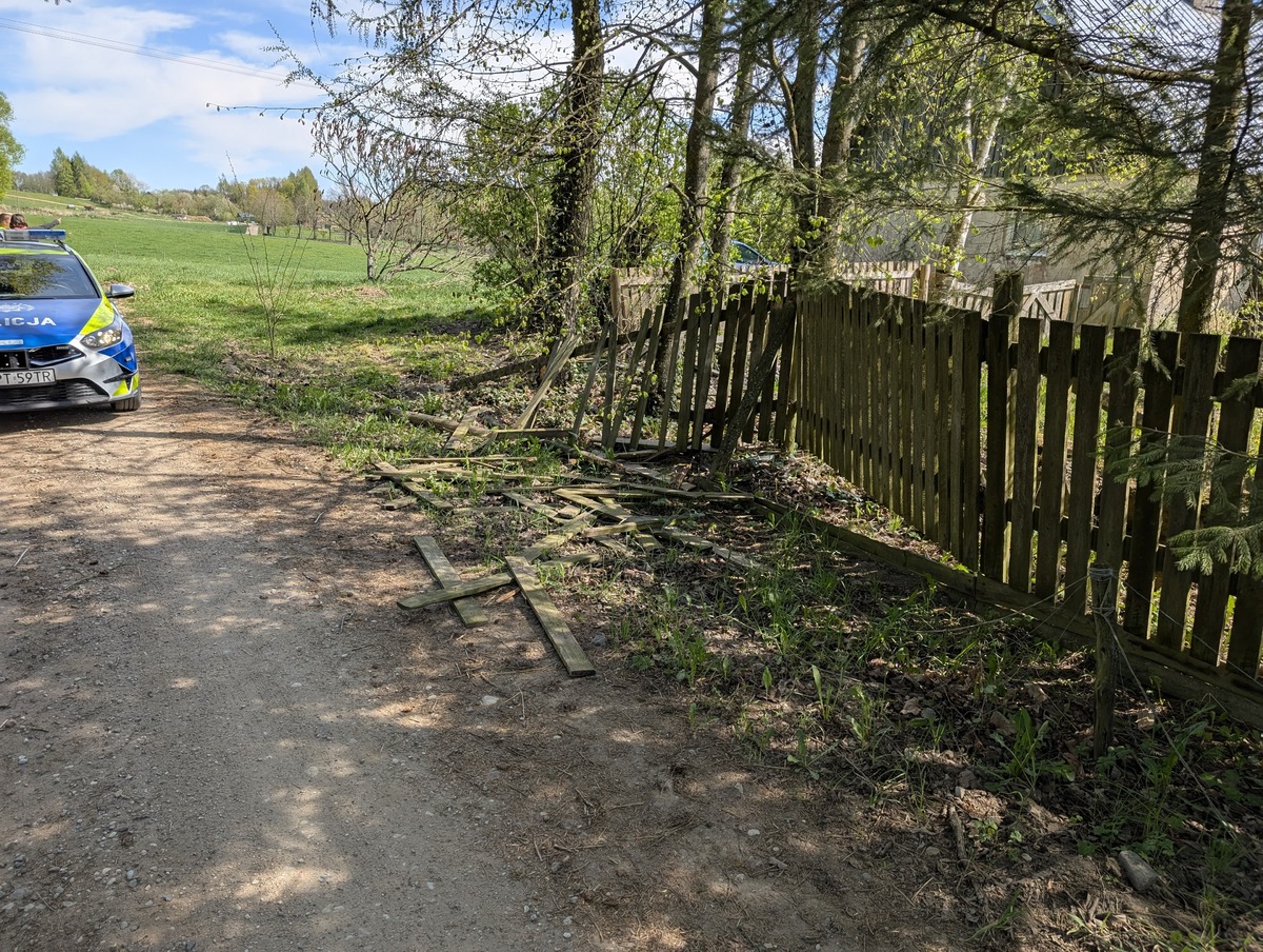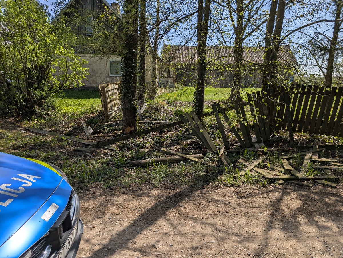 Policjanci opatrolowali teren przyległy i niedaleko posesji ujawnili rozbite BMW bez przymocowanych tablic rejestracyjnych. W trakcie prowadzonych czynności do mundurowych zgłosił się mężczyzna, który okazał się być właścicielem pojazdu. Policjanci ustalili, że w piątek (18 kwietnia) 23-letni mężczyzna kierując pojazdem marki BMW nie dostosował prędkości do warunków panujących na drodze, zjechał na lewą stronę drogi i uderzył w drewniany płot.
