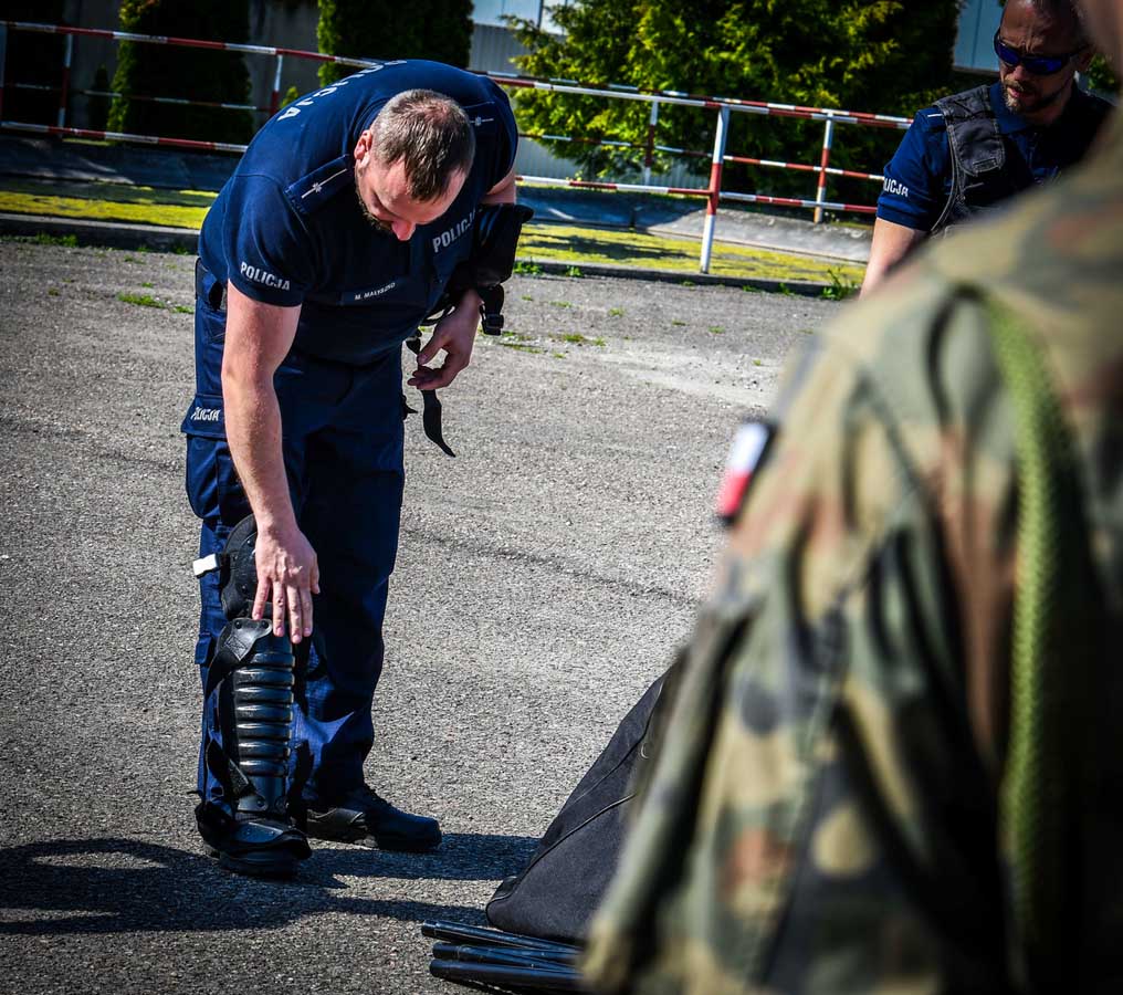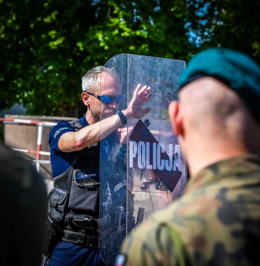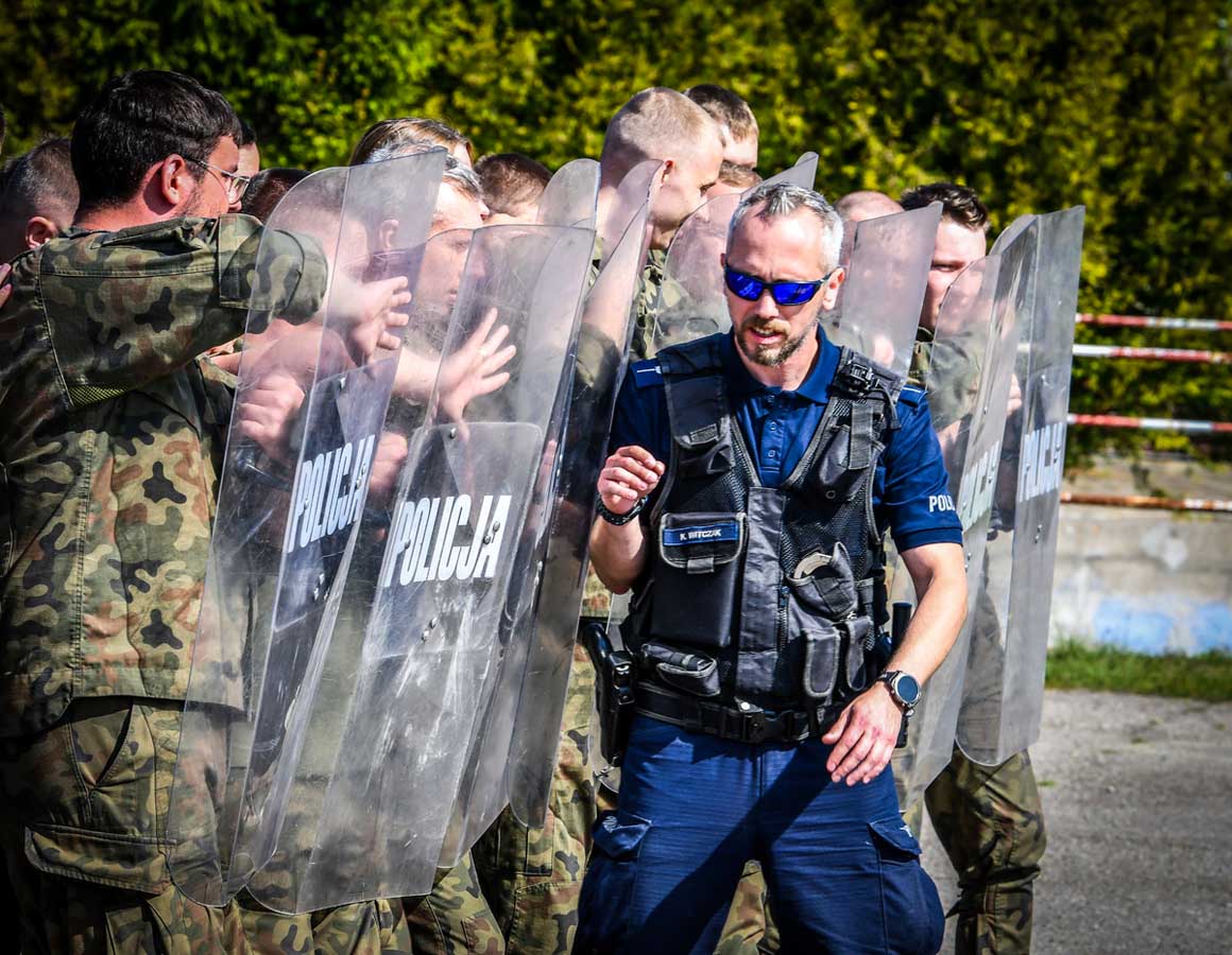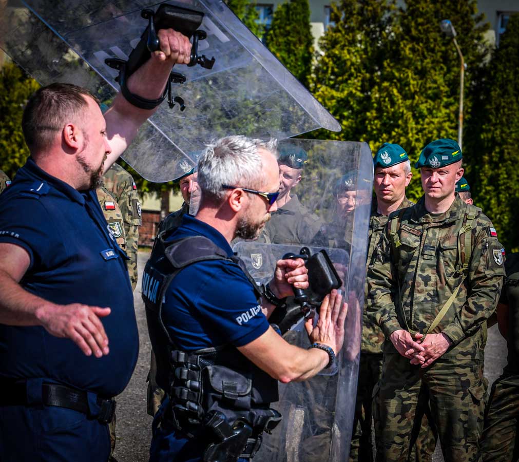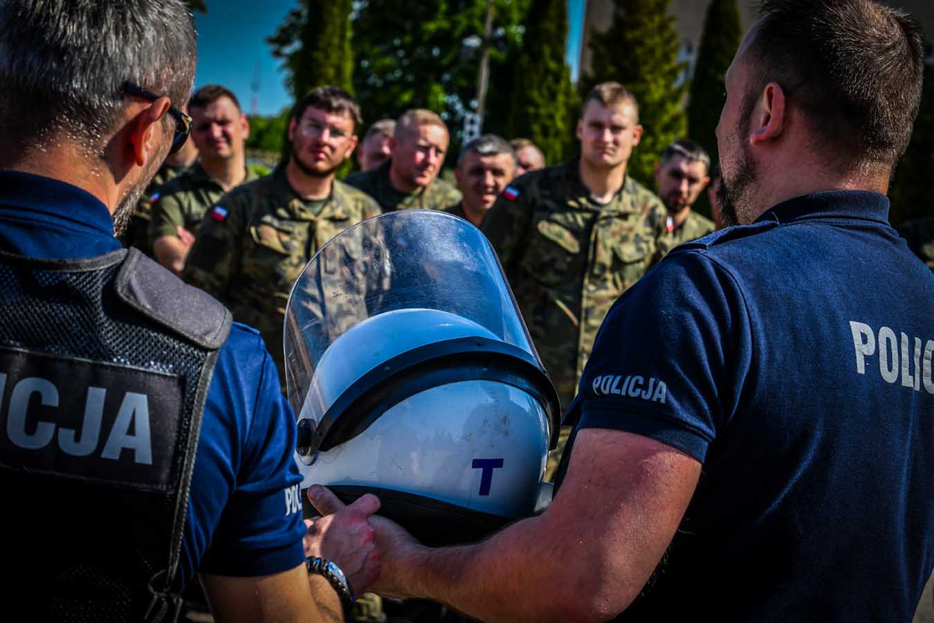 Jedno z takich szkoleń odbyło się w środę (28 maja). Funkcjonariusze zapoznali żołnierzy z zasadami formowania tyraliery policyjnej oraz użycia środków przymusu bezpośredniego. Ćwiczyli z żołnierzami sposoby ochrony przed atakami z użyciem kamieni i noży, operowania w szyku bojowym oraz użycia tarcz i miotaczy gazu. Policjanci omówili zasady działania i przybliżyli sposób wykorzystania strzelby gładkolufowej oraz amunicji niepenetracyjnej.