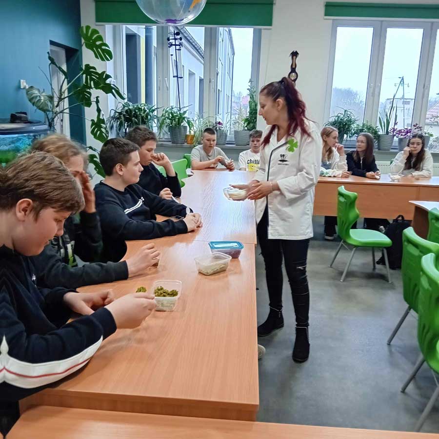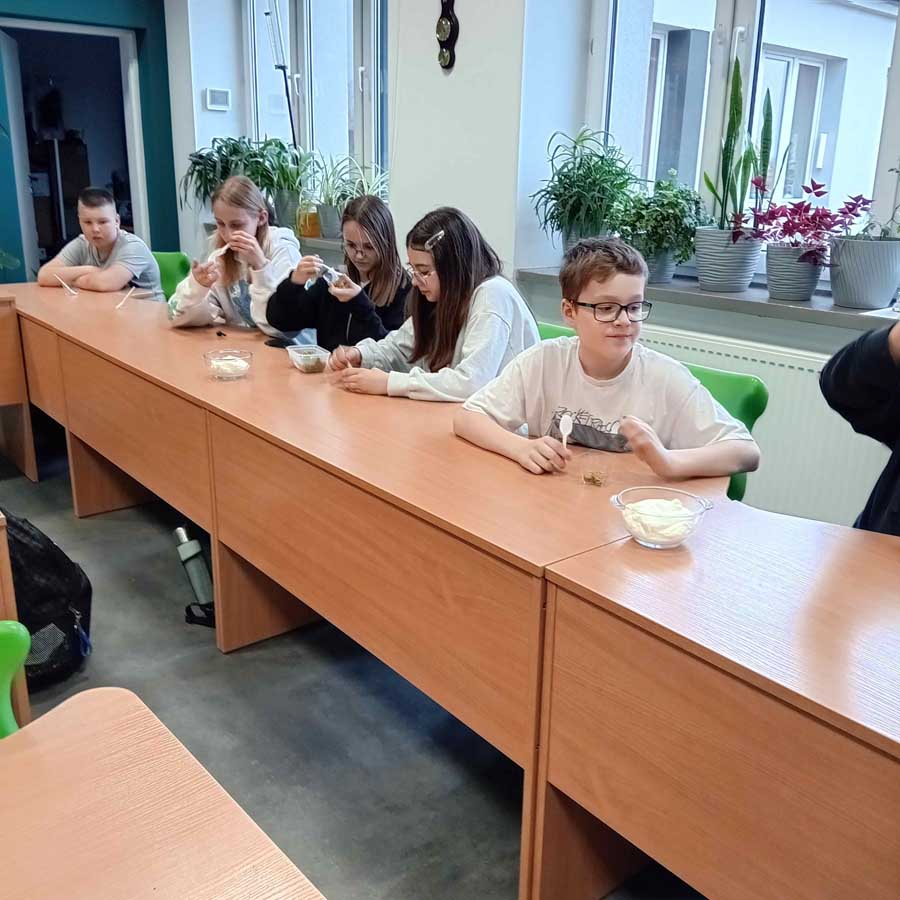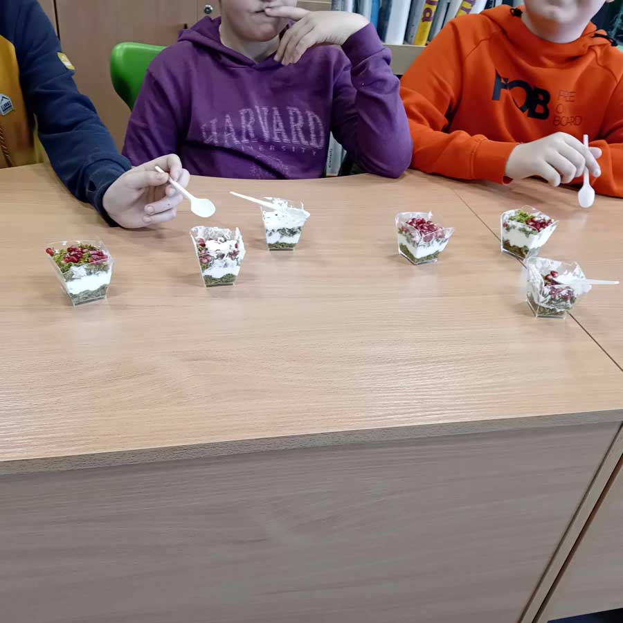Podczas kolejnych warsztatów, tym razem kulinarnych, pani Ewelina Zawistowska pokazała uczniom, jak w prosty sposób przygotować zdrowy i smaczny deser z wykorzystaniem naturalnych składników – szpinaku, śmietany i owoców. Powstał „leśny mech” – zielony, puszysty przysmak, który nie tylko wyglądał efektownie, ale również zachwycał smakiem. To doskonały przykład na to, że zdrowe jedzenie może być jednocześnie pyszne i atrakcyjne wizualnie.