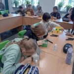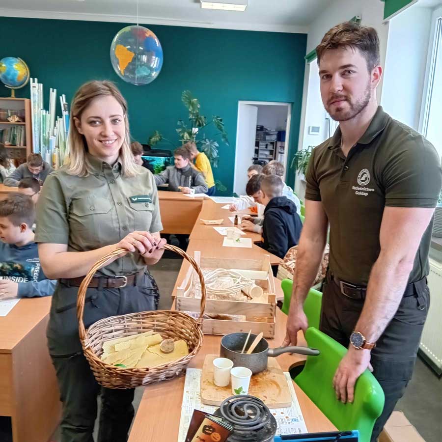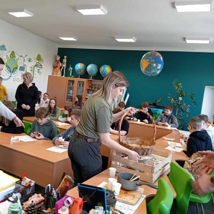 W ramach Zielonych Dni uczniowie mieli również okazję spotkać się z leśnikami z Nadleśnictwa Gołdap. Pod ich okiem powstawały niezwykłe medaliony z naturalnych materiałów – wosku pszczelego i suszonych kwiatów. W ekopracowni unosił się zapach topionego wosku i aromatycznych ziół, tworząc atmosferę bliskości z naturą.