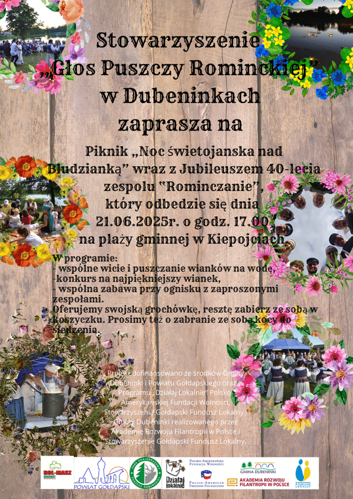 Wielkimi krokami zbliża się piknik „Noc świętojańska nad Bludzianką”, organizowany przez stowarzyszenie „Głos Puszczy Rominckiej” we współpracy z Kołem Gospodyń Wiejskich i zespołem „Bobolanie” z Dubeninek.