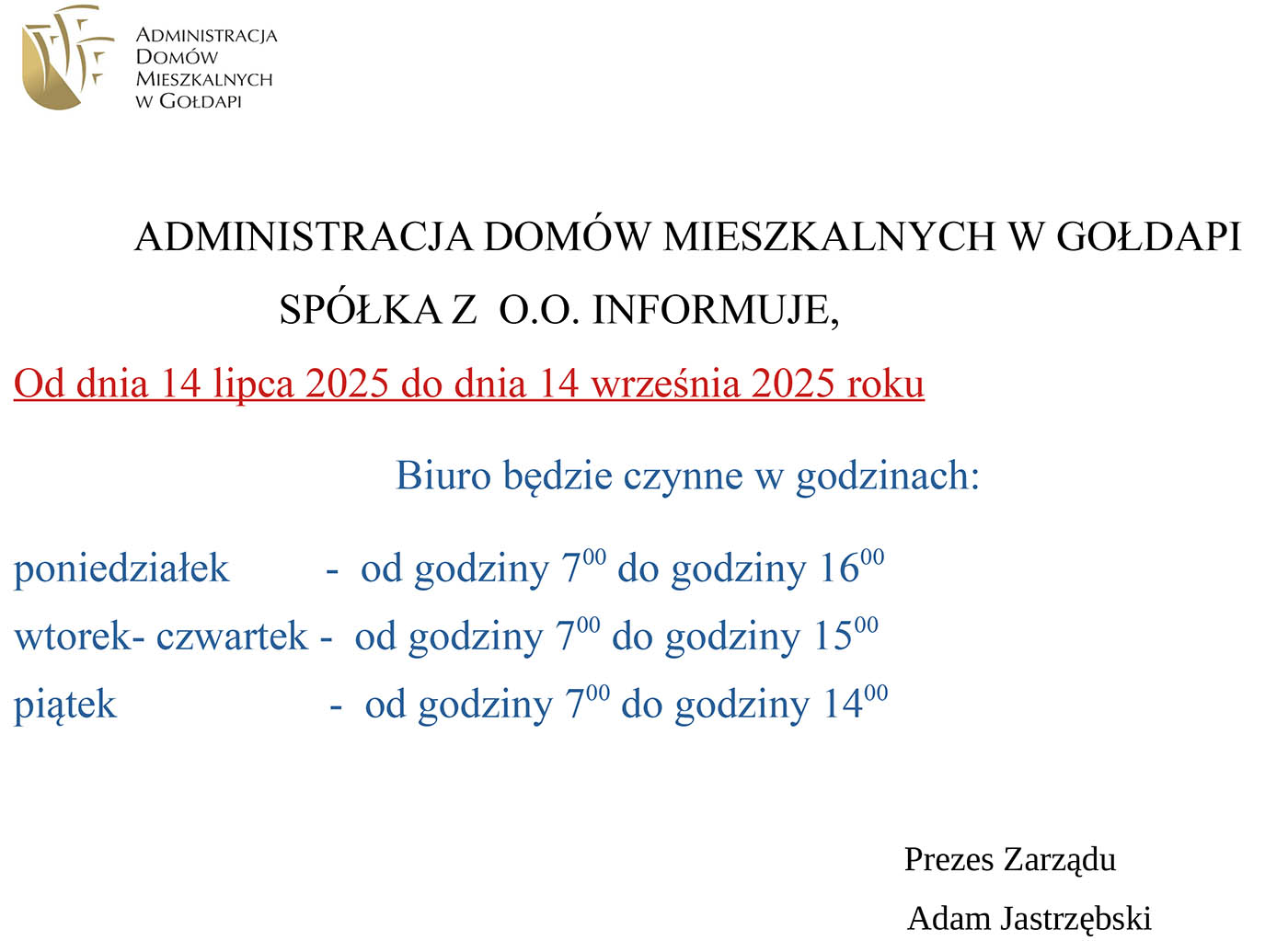 ADMINISTRACJA DOMÓW MIESZKALNYCH W GOŁDAPI SPÓŁKA Z O.O. INFORMUJE