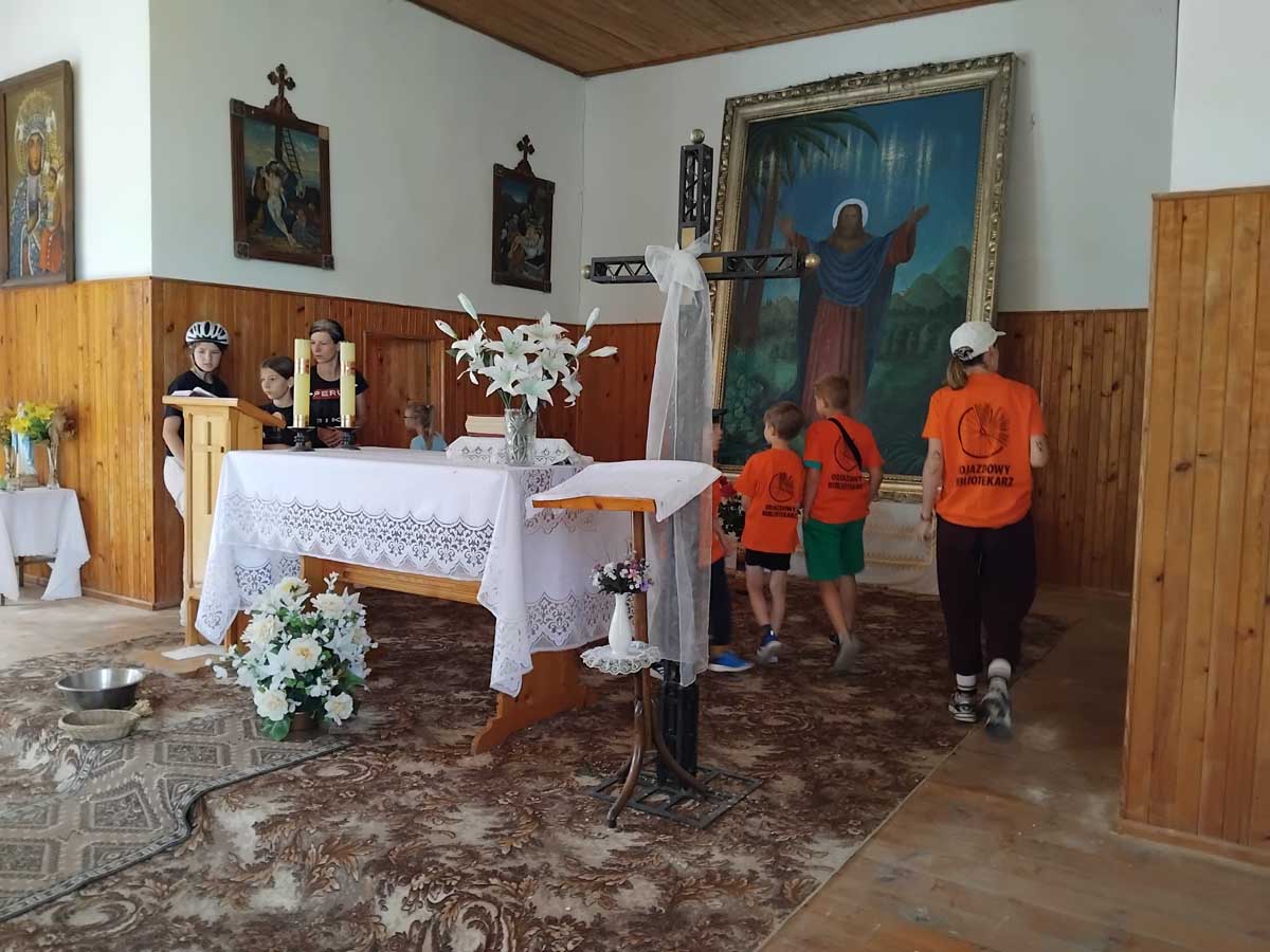 Po dawce artystycznych wrażeń przejechaliśmy kilkanaście metrów dalej, aby zajrzeć do pięknej kaplicy filialnej w Grodzisku w poszukiwaniu jej historii. Kolejnym punktem wycieczki była osada – grodzisko leżące na wysokim wzgórzu morenowym, dominującym nad okolicą. Obiekt o lokalnej nazwie grodzisko to stanowisko archeologiczne objęte ochroną konserwatorską. Grodzisko ma kształt owalny, bardzo charakterystycznym elementem grodziska był znajdujący się mniej więcej w części centralnej staw. Powierzchnia grodziska jest częściowo zniszczona okopami i umocnieniami z czasów II wojny światowej. Obecnie większa część obiektu porośnięta jest wysoką trawą oraz nielicznymi, pojedynczymi drzewami.