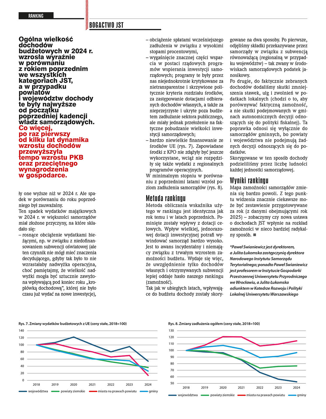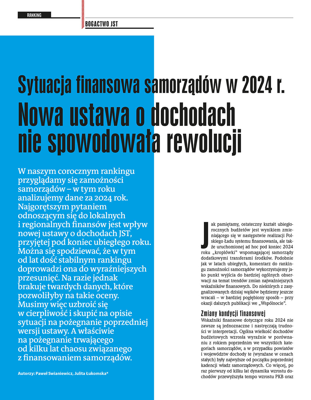 Otrzymaliśmy kolejny ranking od Pisma Samorządu Terytorialnego „Wspólnota”. Tym razem dotyczy sytuacji finansowej jednostek samorządu terytorialnego w 2024 roku. Ranking ukazany jest w tabelach z zaznaczeniem dochodu per capita (na osobę).