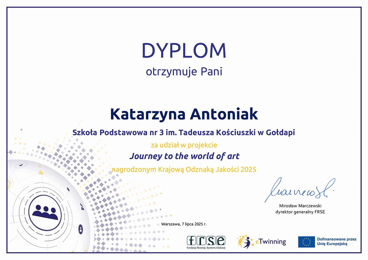 Z przyjemnością informujemy, że Szkoła Podstawowa nr 3 im. Tadeusza Kościuszki już po raz kolejny otrzymała Krajową Odznakę Jakości (National Quality Label) za realizację międzynarodowego projektu eTwinning pt. „Journey to the world of art”(„Podróż do świata sztuki”).