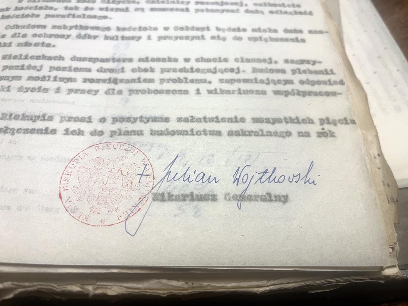 Pod pismem widnieje podpis ks. Juliana Wojtkowskiego, ówczesnego Wikariusza Generalnego Diecezji Warmińskiej.
