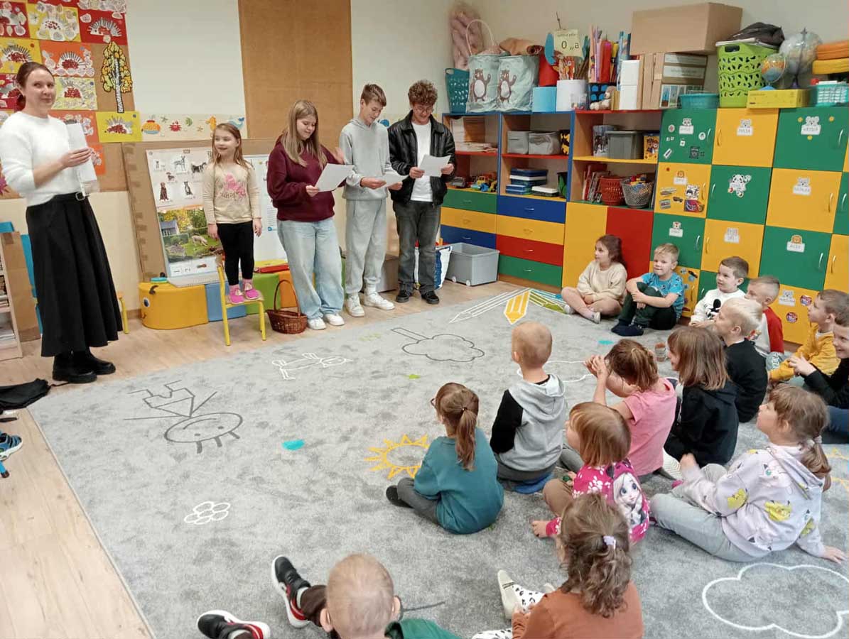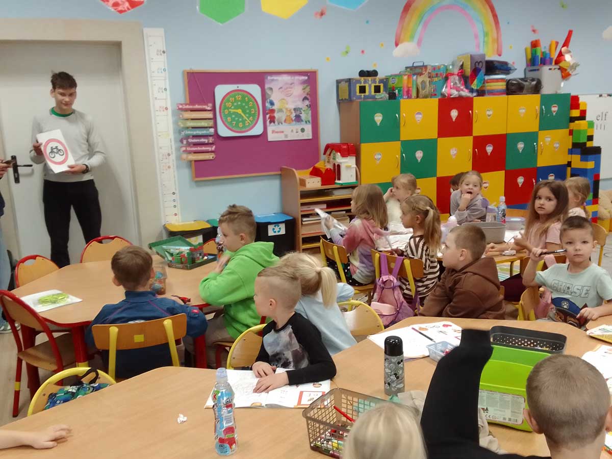 Uczniowie kl. 8a i 8b, Kacper Karwel, Mykhail Shpak, Julia Buraczewska, Michał Zieliński i Mikołaj Metelski, wybrali się ze swoimi wychowawcami do klas 0a i 0b, aby przypomnieć zasady bezpieczeństwa w ruchu drogowym.