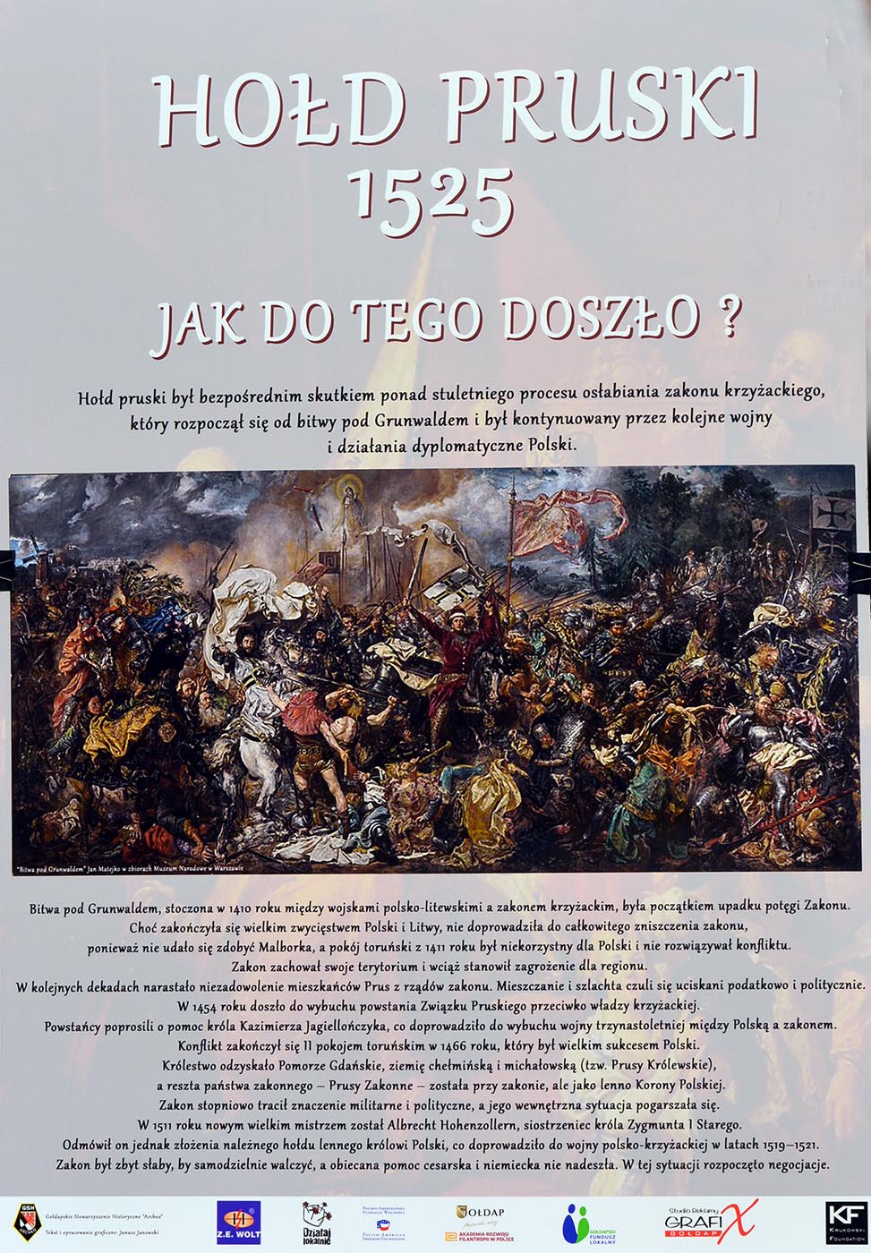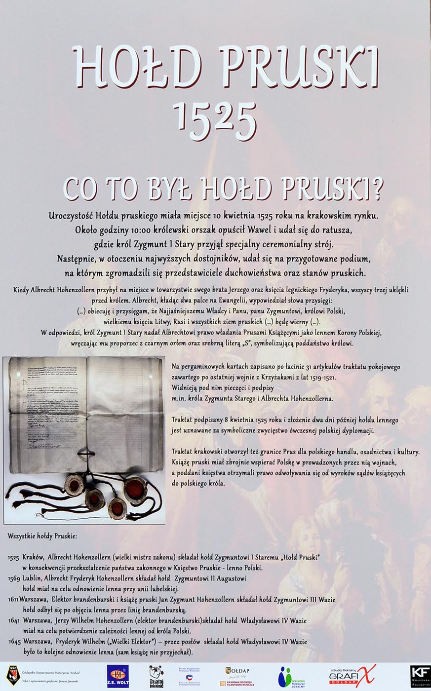 Nie po raz pierwszy Gołdapskie Stowarzyszenie Historyczne „Archeo” organizuje plenerowe pokazy swojej działalności ze stoiskami kolekcjonerskimi. Jednak w sobotę na boisku gołdapskiej „Piątki” miały miejsce dodatkowe atrakcje, m.in. zawody sportowo-pożarnicze OSP i MDP, prezentacje służb mundurowych, klubu strzeleckiego oraz wystawa z okazji 500-lecia Hołdu Pruskiego.