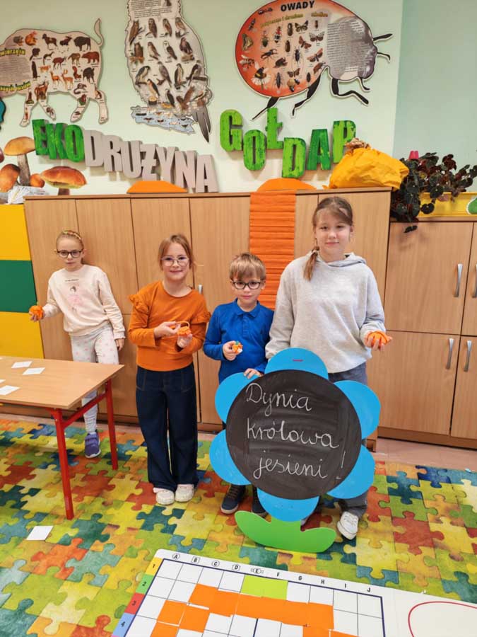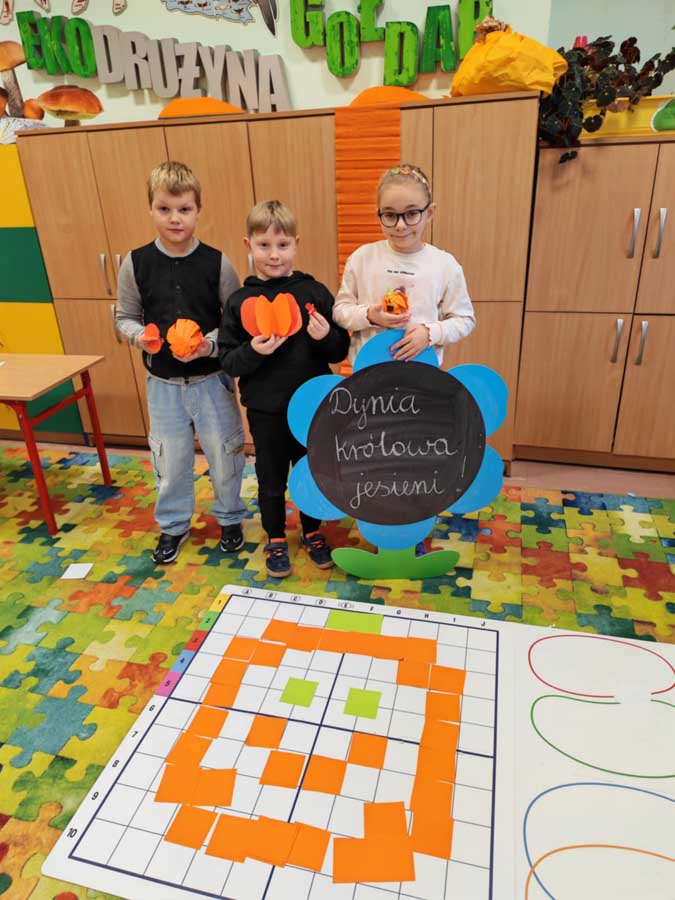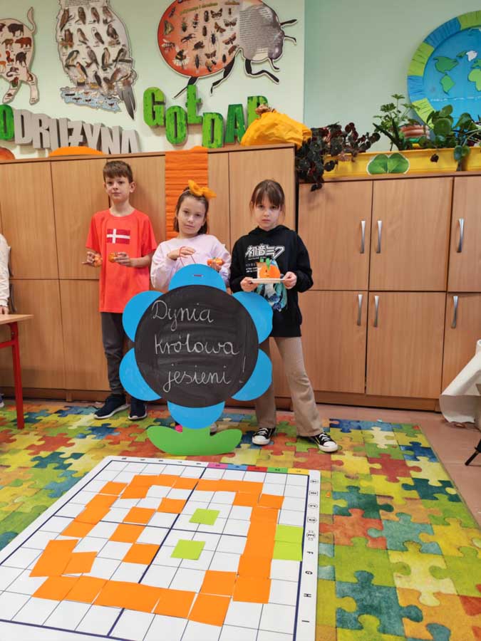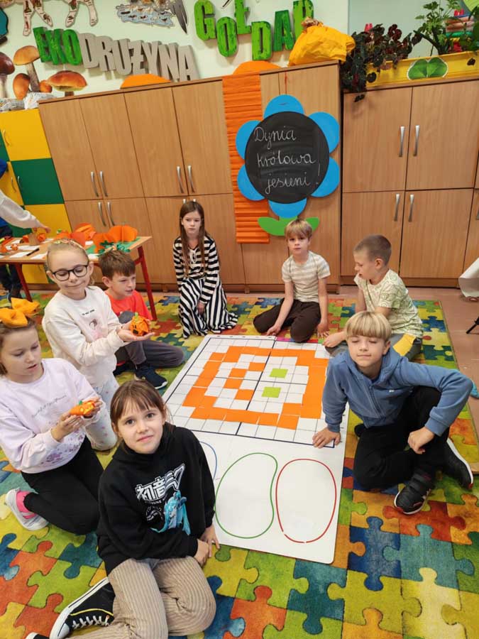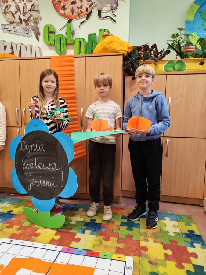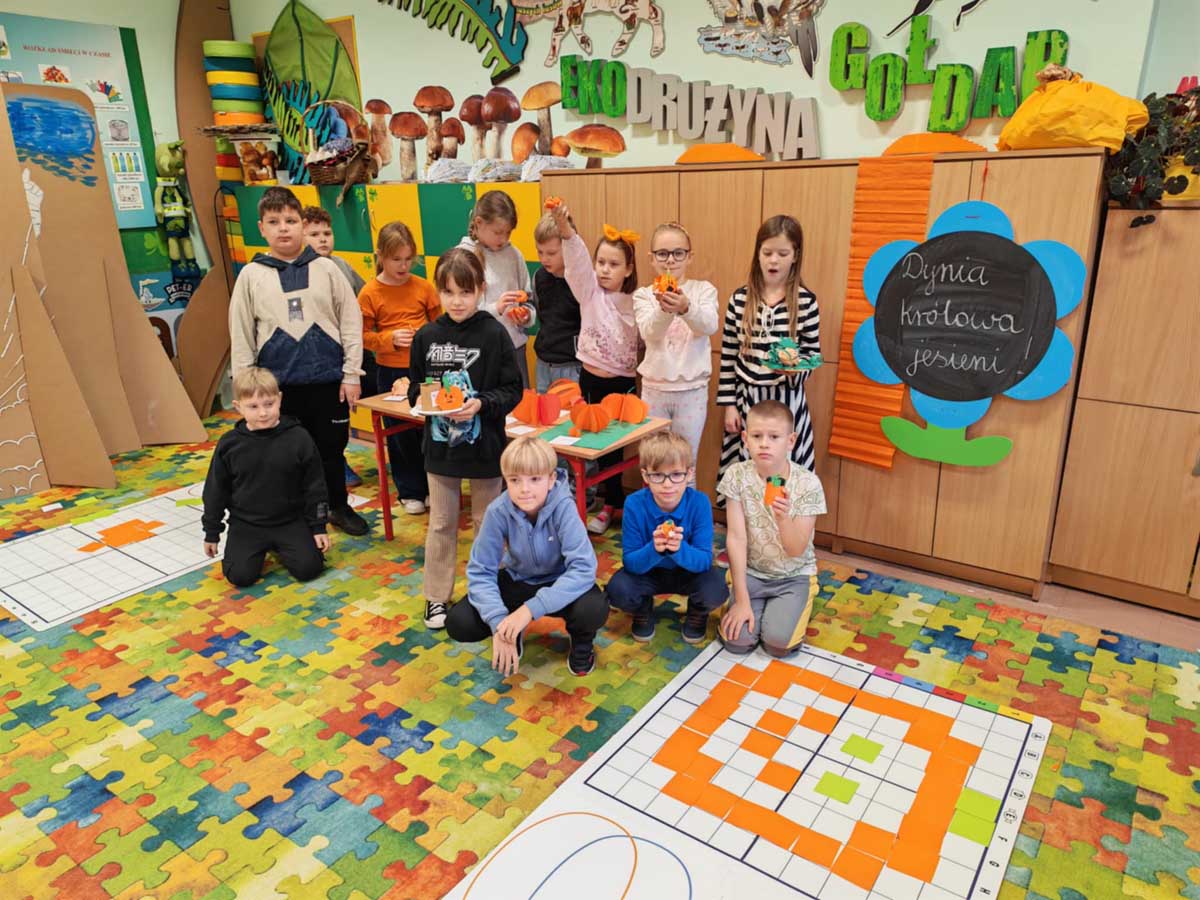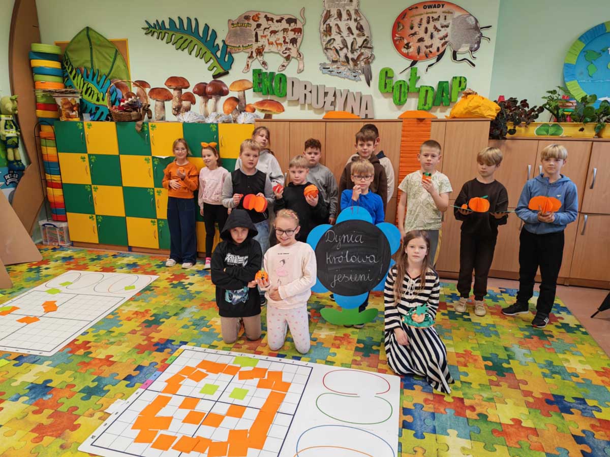 Podczas listopadowych poranków odkrywaliśmy uroki jesieni. Były twórcze zabawy łączące aktywność fizyczną z matematyką, językiem polskim, muzyką, plastyką i przyrodą. Zaczęliśmy od Dnia Dyni – poznawaliśmy wtedy różne jej odmiany. Opisywaliśmy je, kodowaliśmy i rozwiązywaliśmy zadania z treścią.