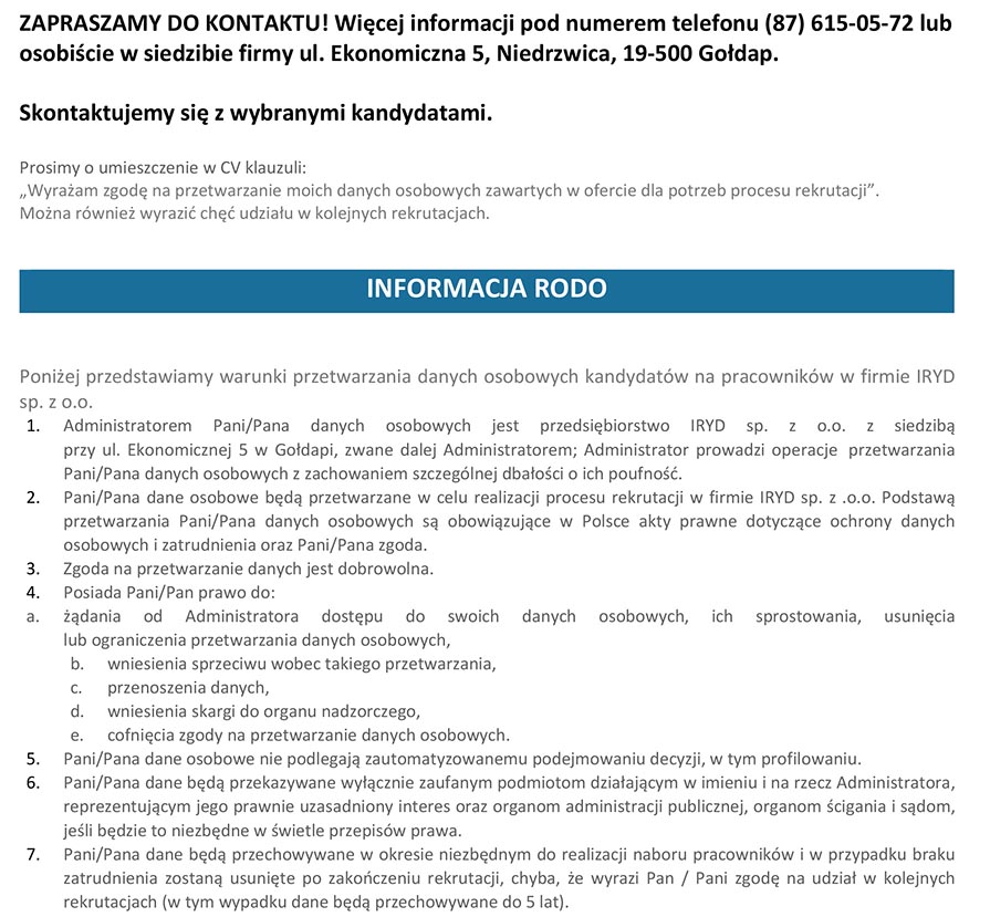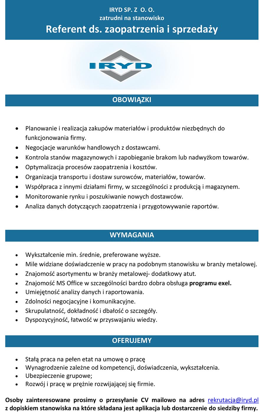 Ogłoszenie. Praca 1 grudnia 2025 redakcja IRYD SP. Z O. O. zatrudni na stanowisko – referent ds. zaopatrzenia i sprzedaży