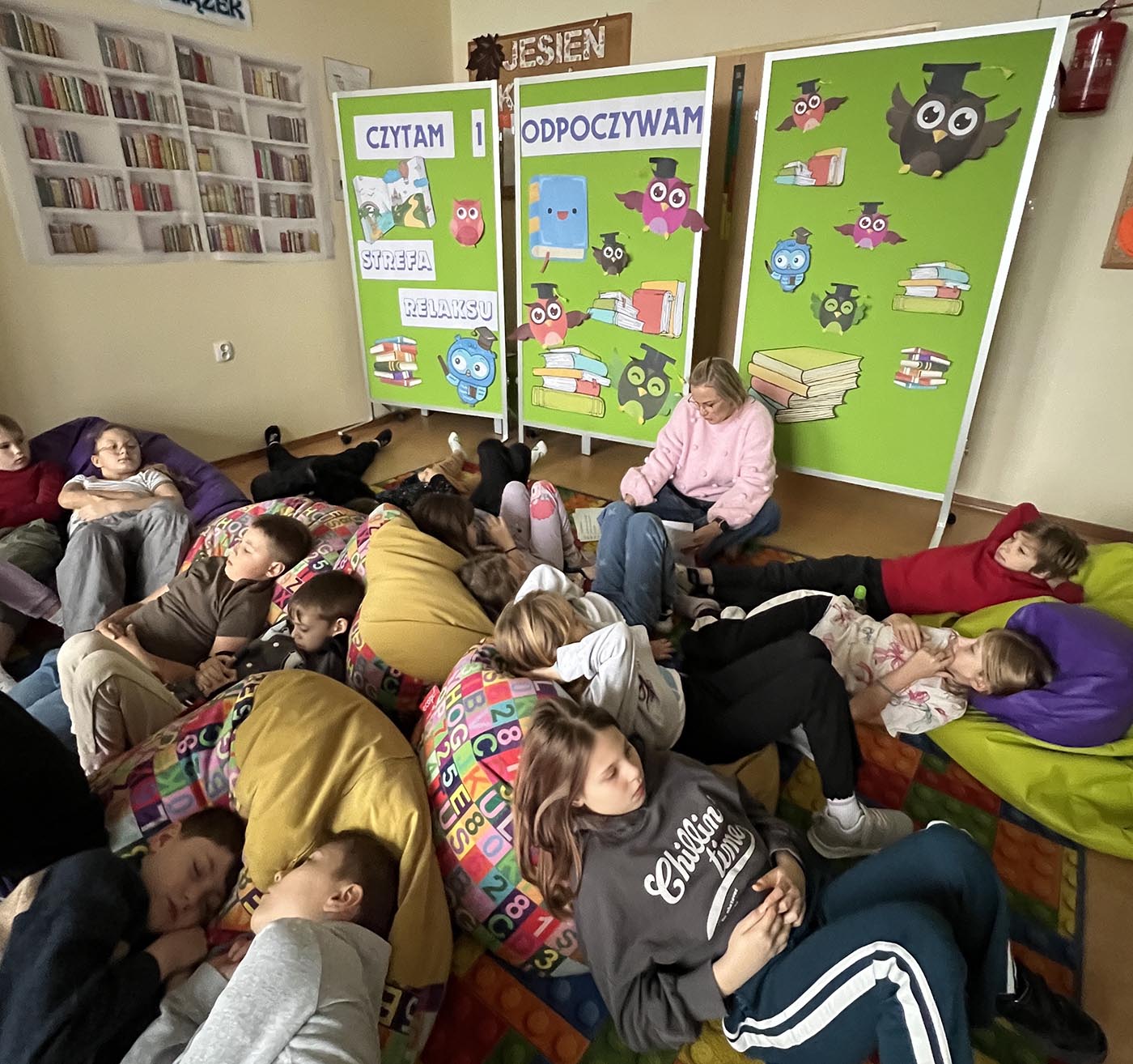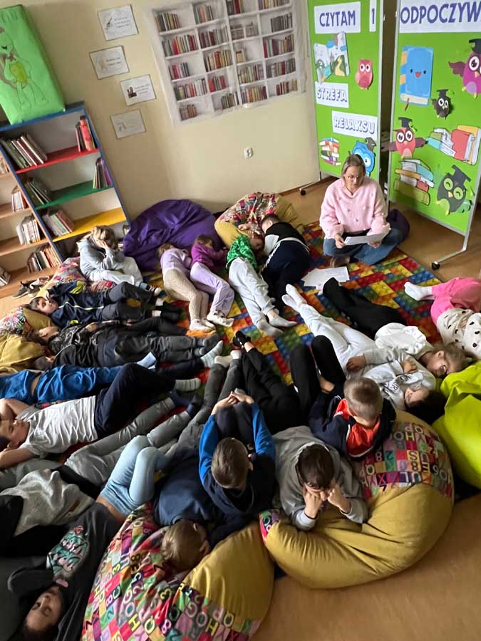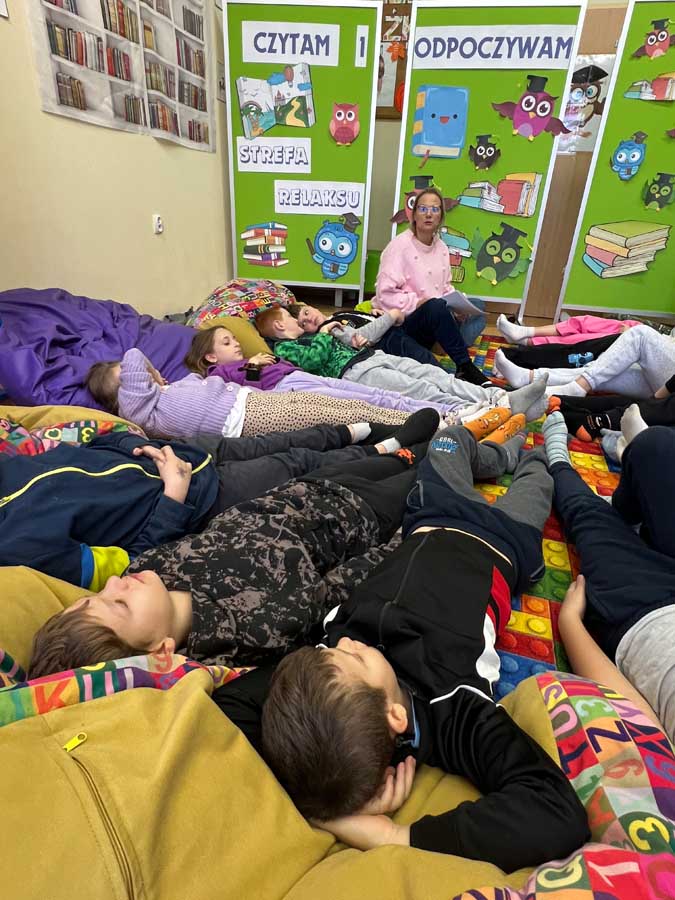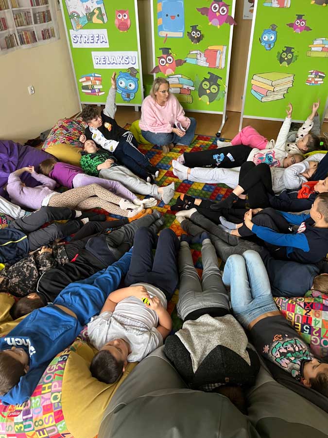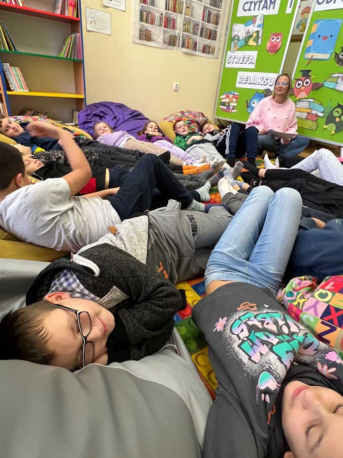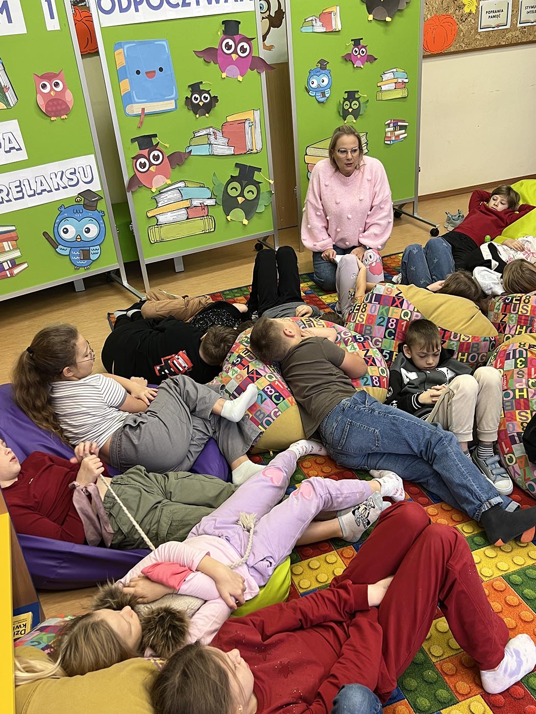 W bibliotece Szkoły Podstawowej nr 5 odbyły się wyjątkowe zajęcia, które miały na celu wprowadzić uczestników w świat relaksu, wyobraźni i twórczego myślenia. Spotkanie połączyło elementy wyciszenia, literatury oraz aktywności plastycznej, tworząc przyjazną przestrzeń do odpoczynku i rozwijania kreatywności.