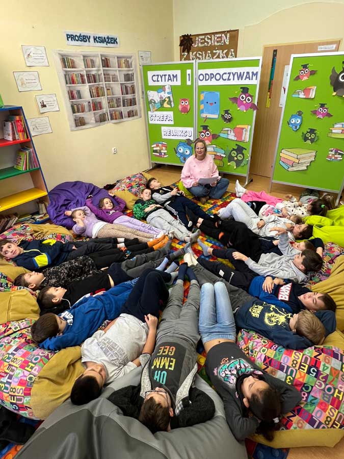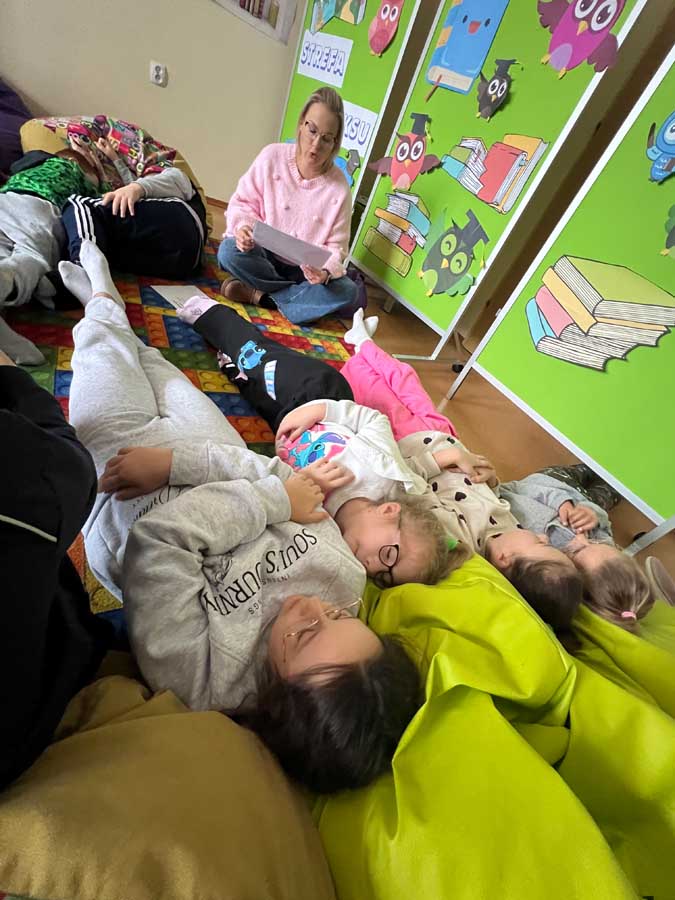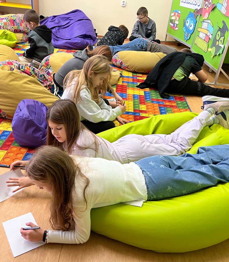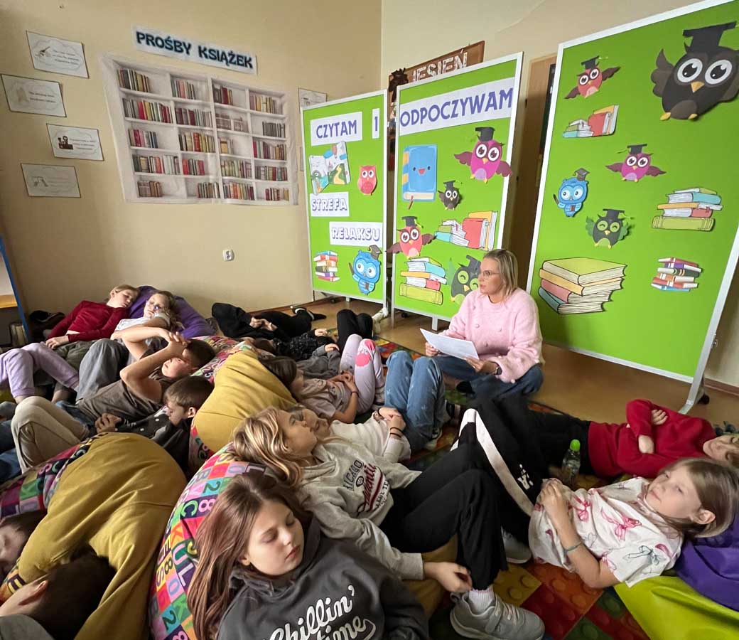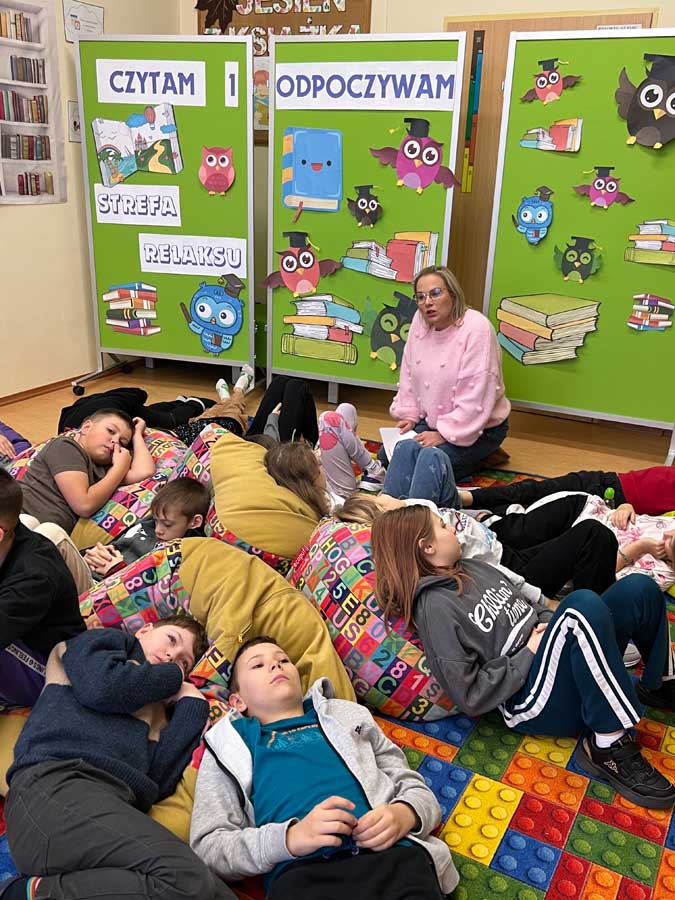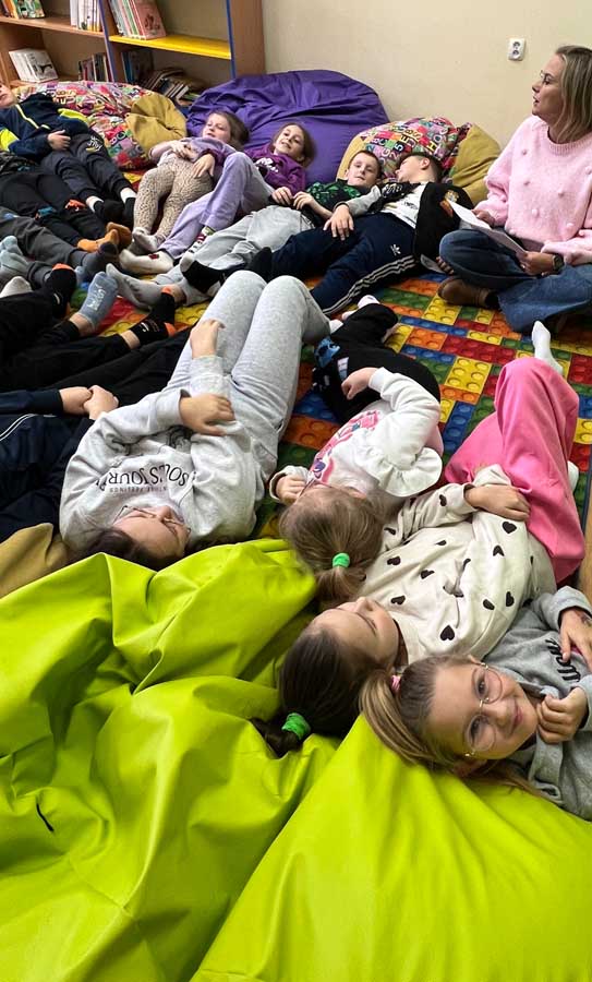 W bibliotece Szkoły Podstawowej nr 5 odbyły się wyjątkowe zajęcia, które miały na celu wprowadzić uczestników w świat relaksu, wyobraźni i twórczego myślenia. Spotkanie połączyło elementy wyciszenia, literatury oraz aktywności plastycznej, tworząc przyjazną przestrzeń do odpoczynku i rozwijania kreatywności.