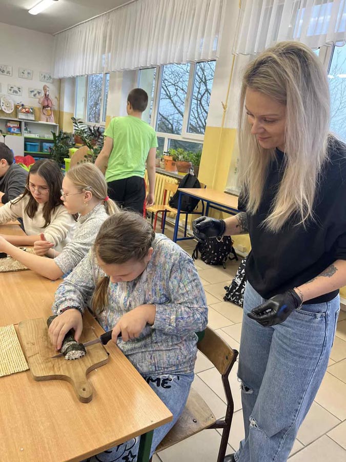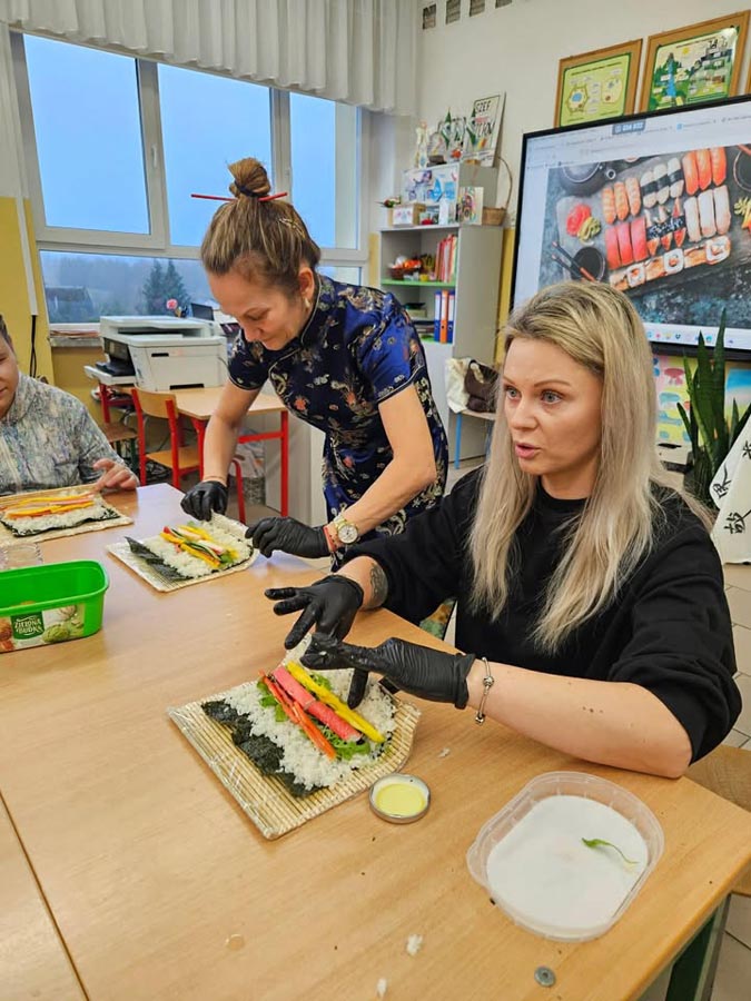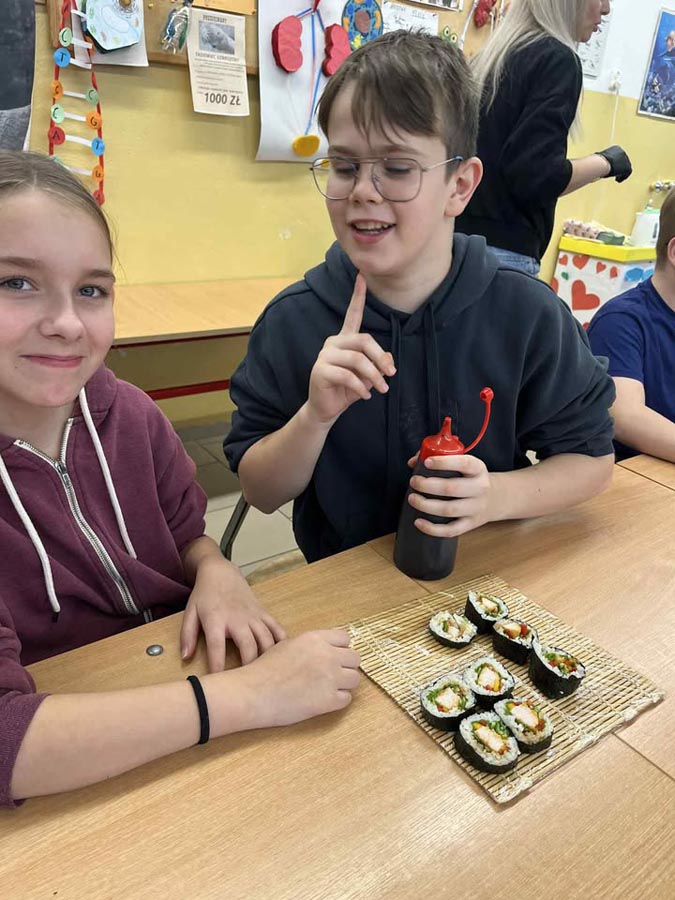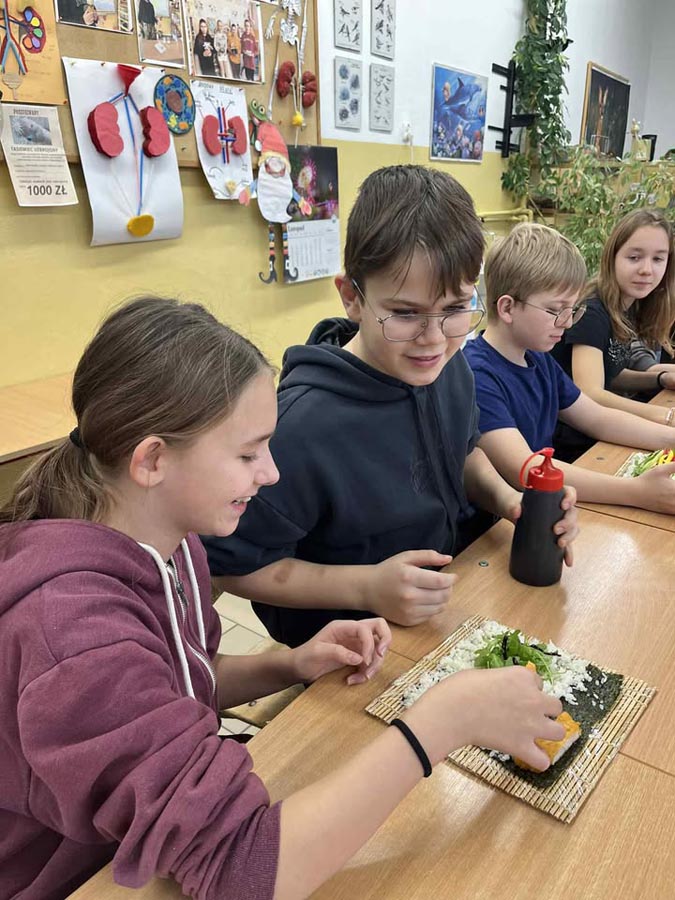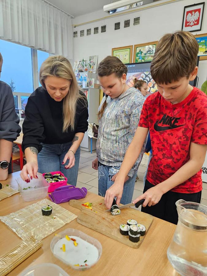 Największą atrakcją okazały się warsztaty sushi dla klasy VI, prowadzone przez panią Marzenę z SushiMa . Uczniowie poznali tajniki przygotowywania sushi i samodzielnie wykonali swoje pierwsze rolki.