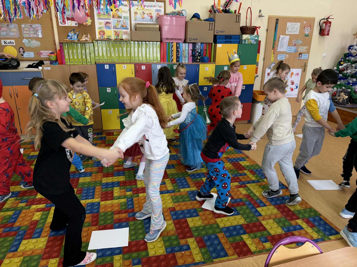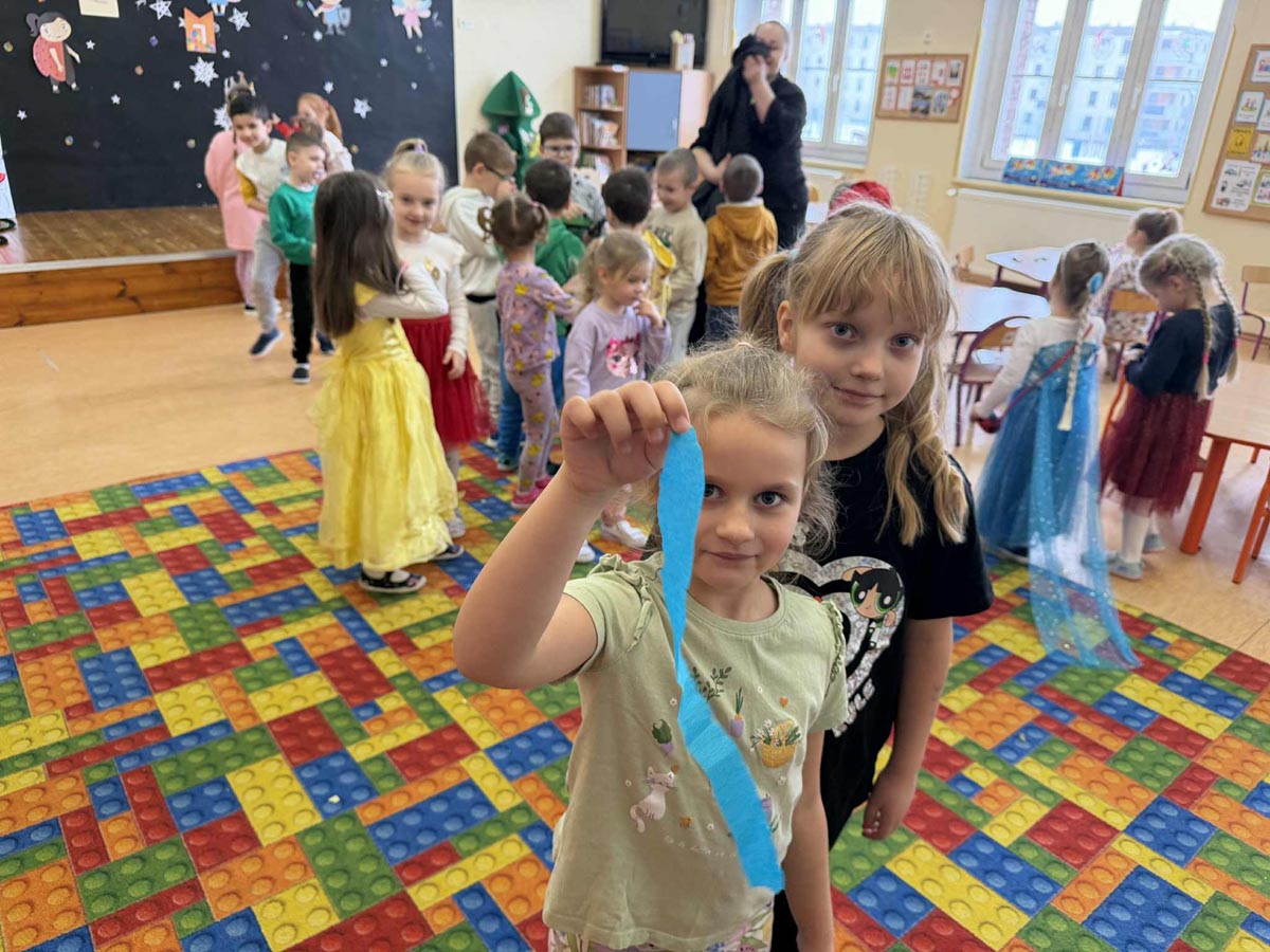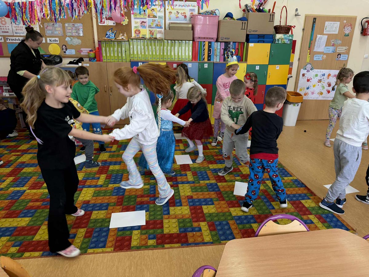 W programie nie zabrakło skocznej muzyki oraz sprawdzonych zabaw, takich jak „taniec na gazecie”, „pociąg”, „co kryją kubeczki”, które wypełniły salę śmiechem. Po intensywnych pląsach dzieci zregenerowały siły przy słodkim poczęstunku, chętnie pozując do zdjęć na tle kolorowych dekoracji.