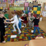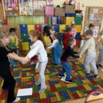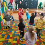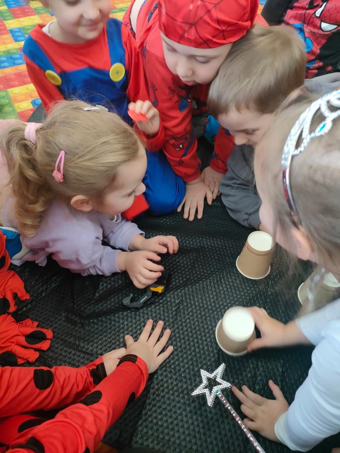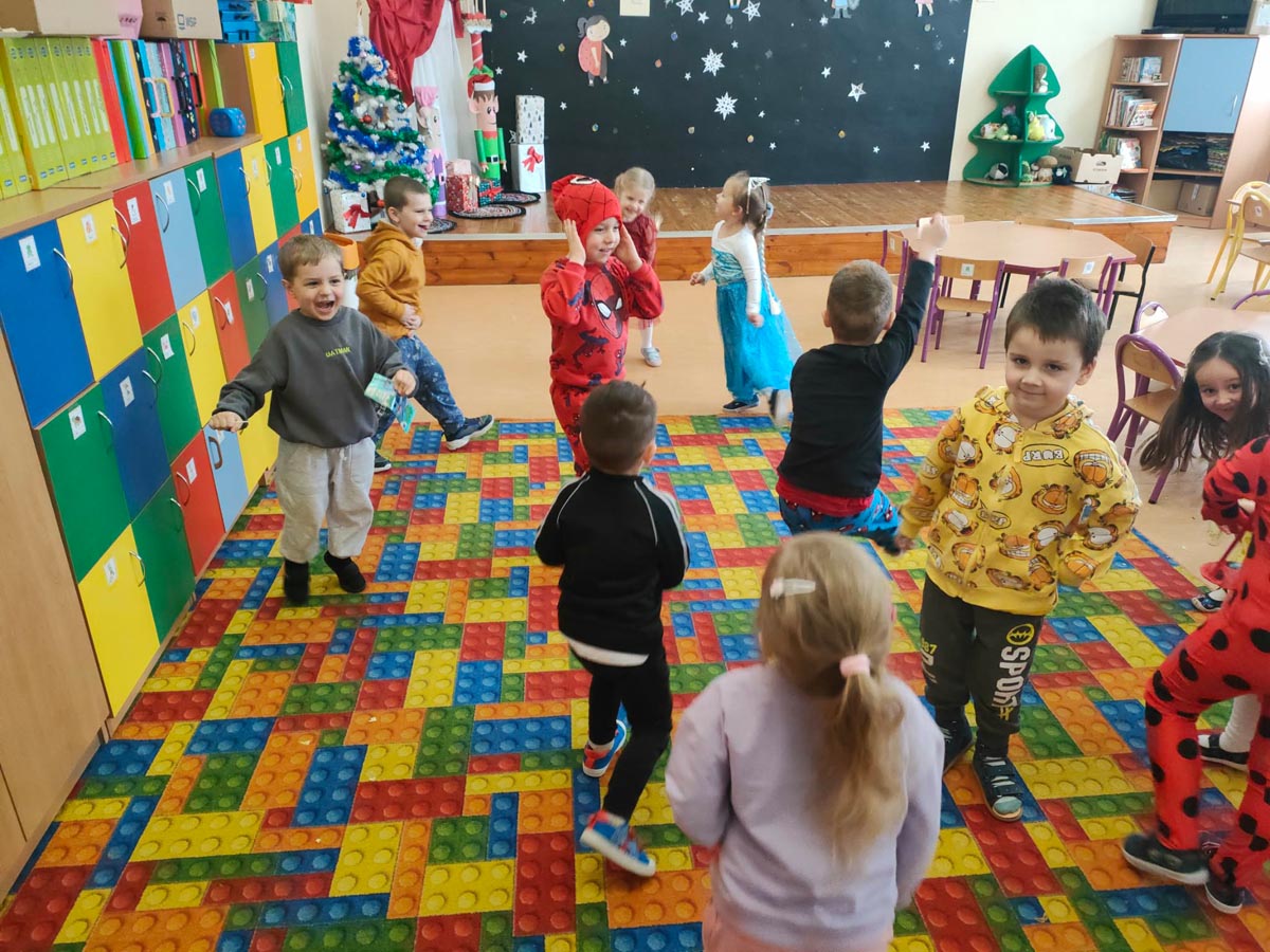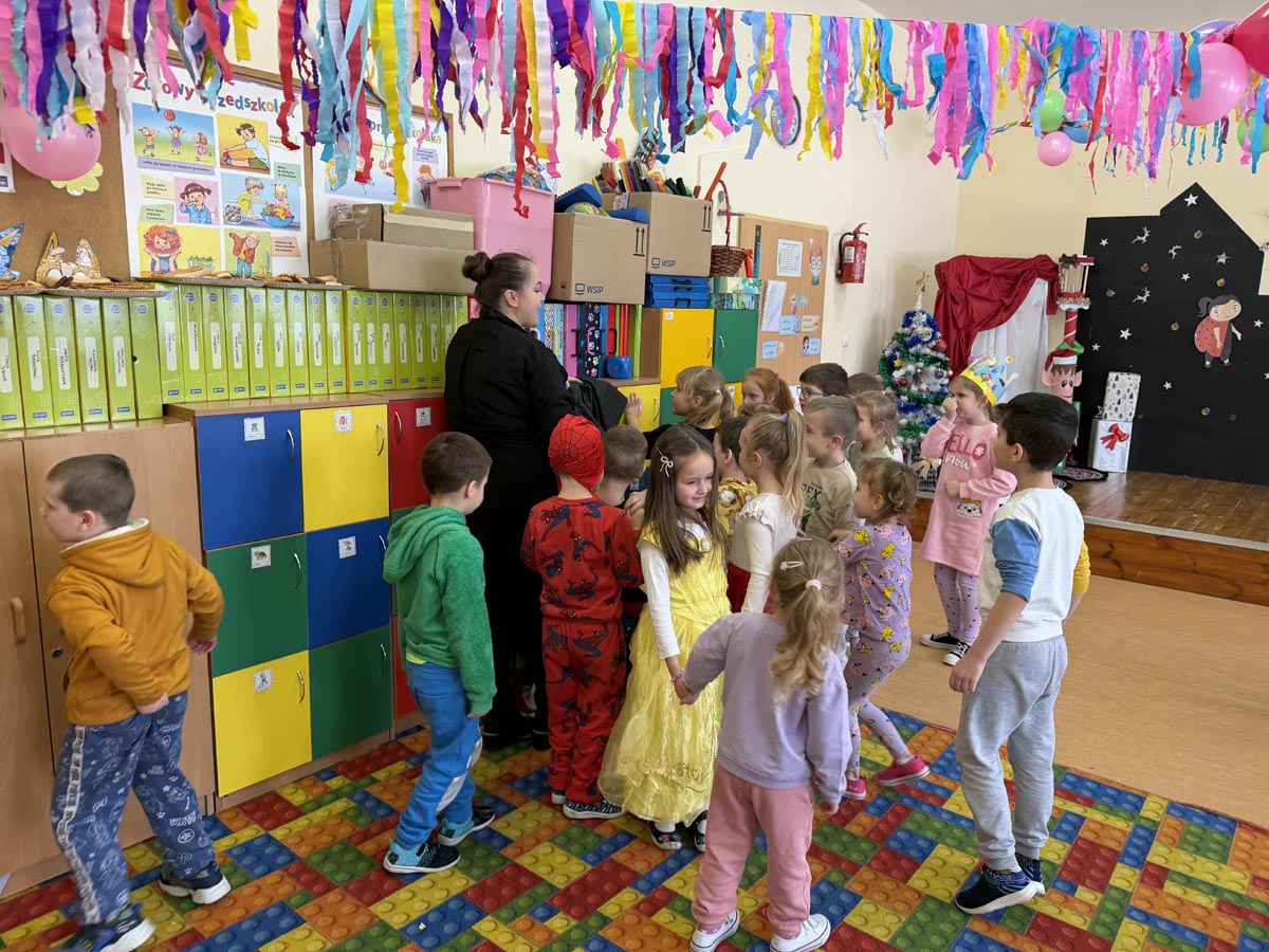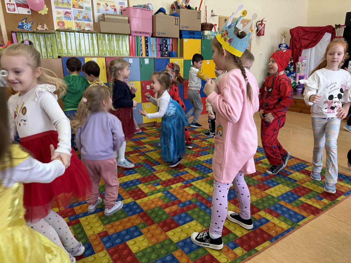 W programie nie zabrakło skocznej muzyki oraz sprawdzonych zabaw, takich jak „taniec na gazecie”, „pociąg”, „co kryją kubeczki”, które wypełniły salę śmiechem. Po intensywnych pląsach dzieci zregenerowały siły przy słodkim poczęstunku, chętnie pozując do zdjęć na tle kolorowych dekoracji.