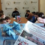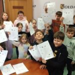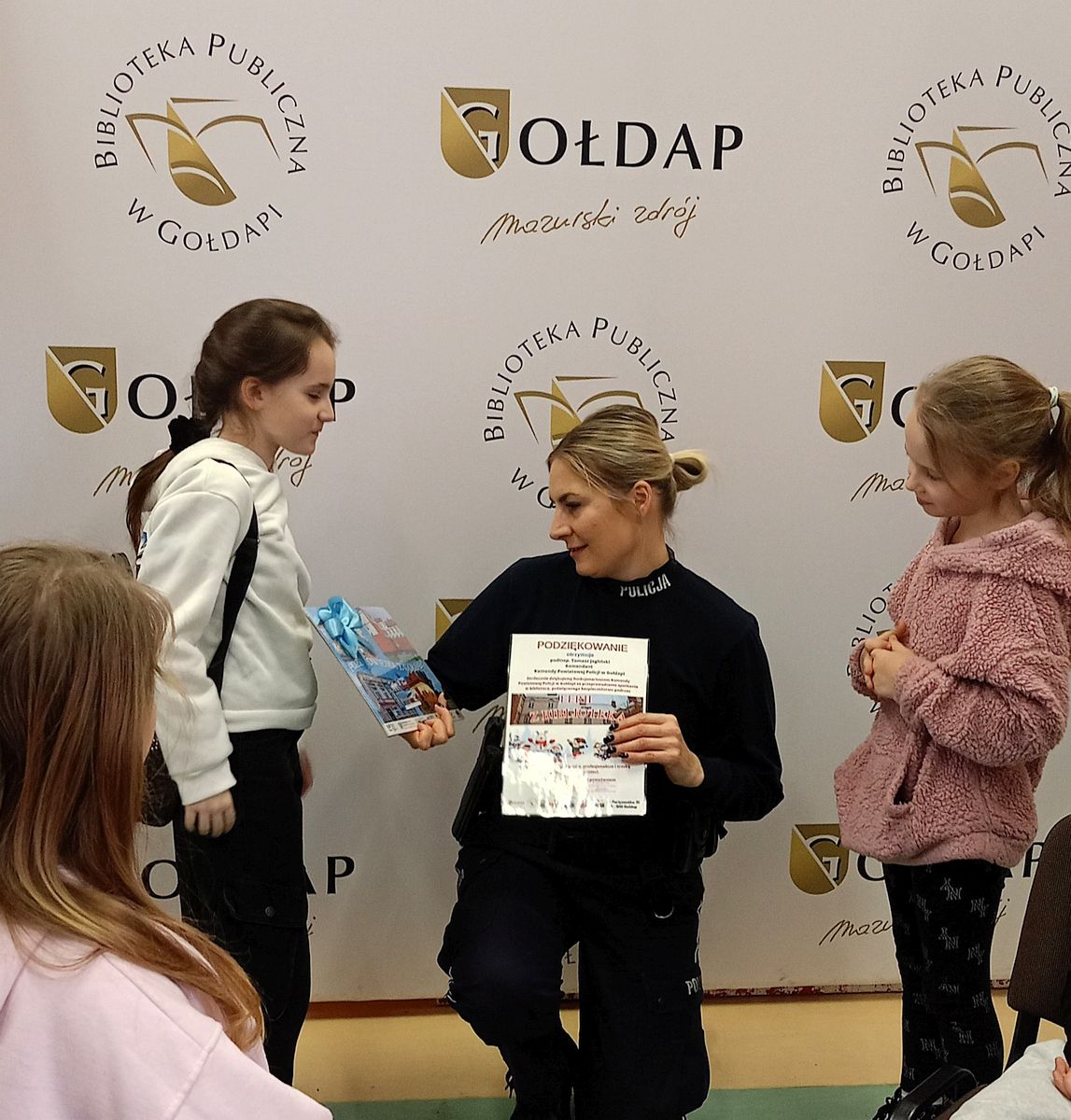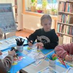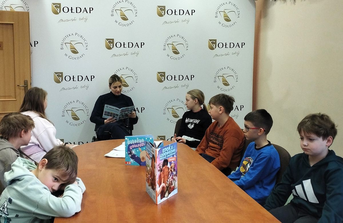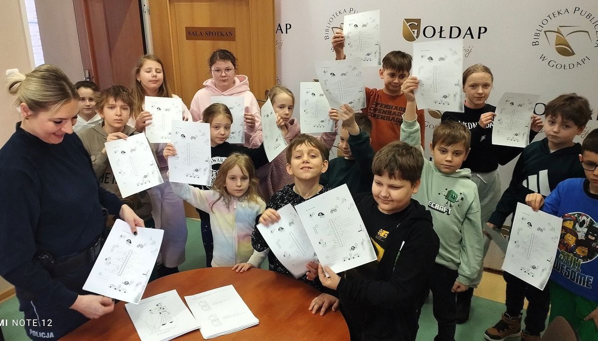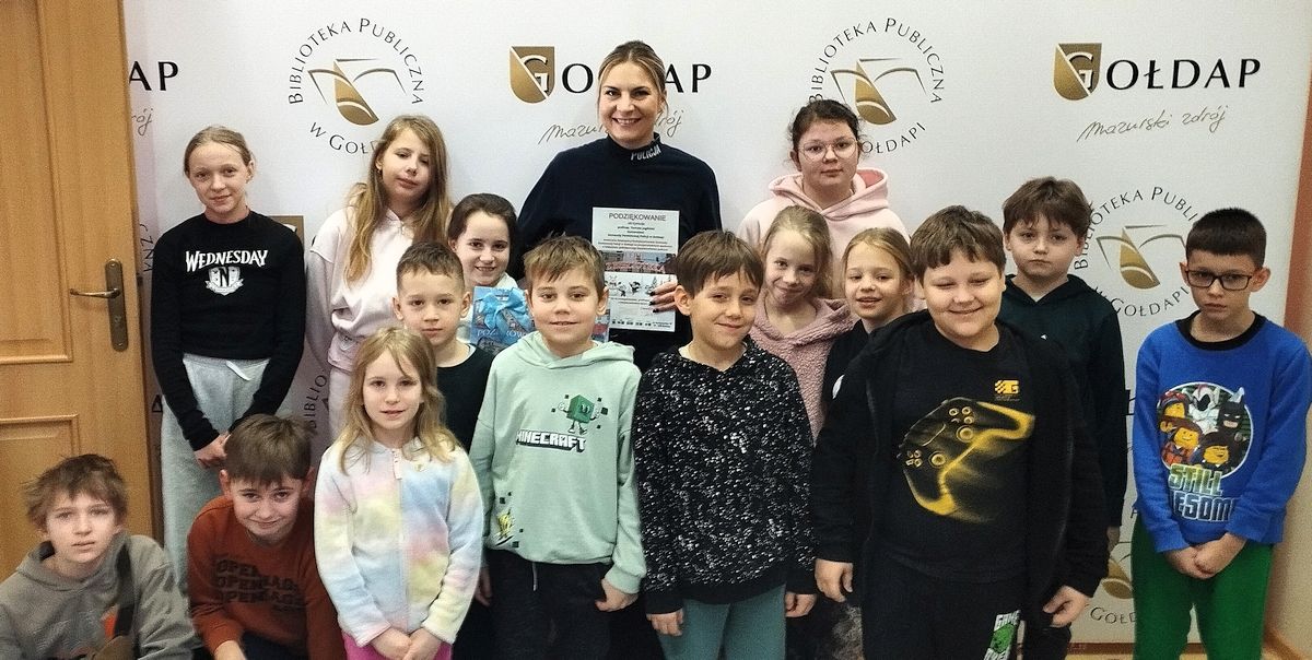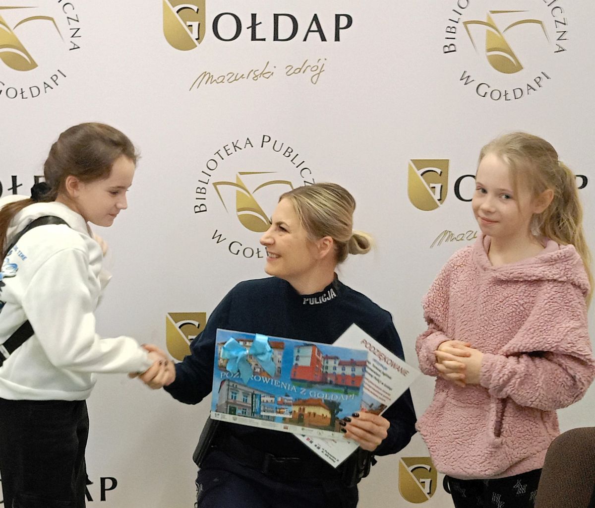 Równocześnie rozpoczęliśmy feryjne zajęcia w bibliotece. Naszym gościem była funkcjonariuszka Komendy Powiatowej Policji w Gołdapi, która rozmawiała z dziećmi o bezpiecznym spędzaniu ferii zimowych. Podczas spotkania dzieci wysłuchały fragmentu książeczki „Zimowe zabawy”, który zachęcał do odpowiedzialnego korzystania z zimowych atrakcji. W ramach podziękowania najmłodsi wręczyli laurkę, a w zamian otrzymali kolorowanki związane z zasadami bezpieczeństwa.