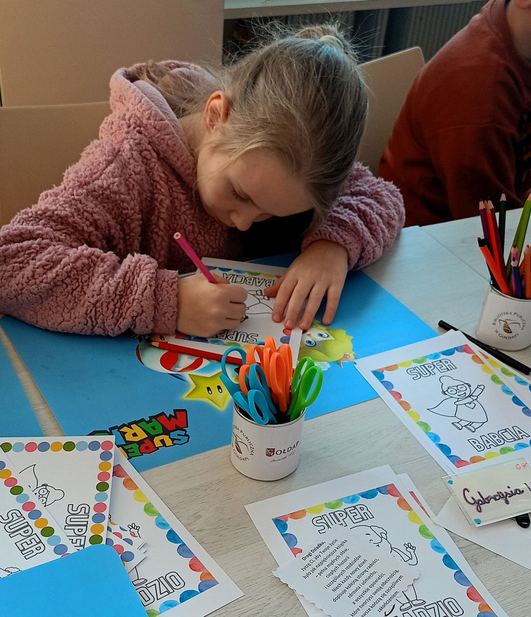 Po części edukacyjnej dzieci z entuzjazmem tworzyły laurki „Super Dziadzio” i „Super Babcia”, a następnie wspólnie bawiły się przy grach planszowych oraz budowie konstrukcji z klocków LEGO.