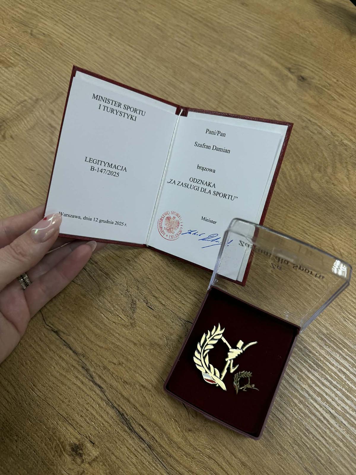 Uroczystość odbyła się dziś w Starostwie Powiatowym, a odznakę „Za Zasługi dla Sportu” wręczono Damianowi Szafranowi, nie tylko sportowcowi z dużymi osiągnięciami, ale jednocześnie trenerowi, animatorowi sportu i założycielowi klubu „Husaria”. Odznakę Gołdapianin przyjął z rąk wojewody Radosława Króla.