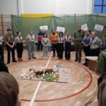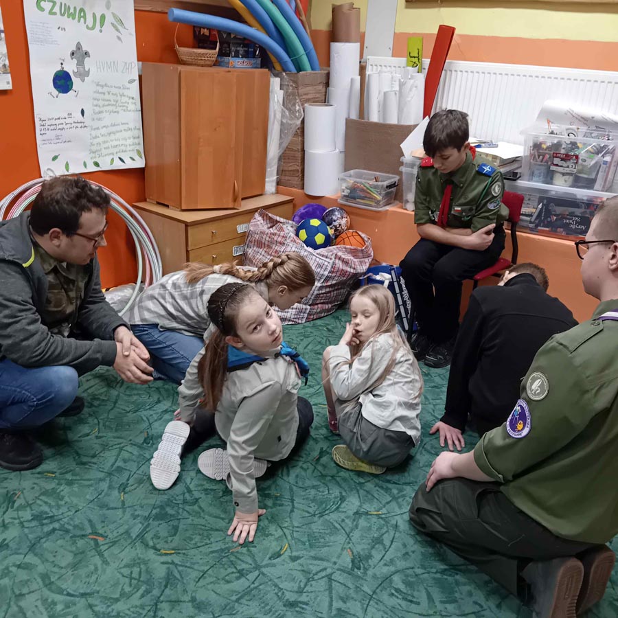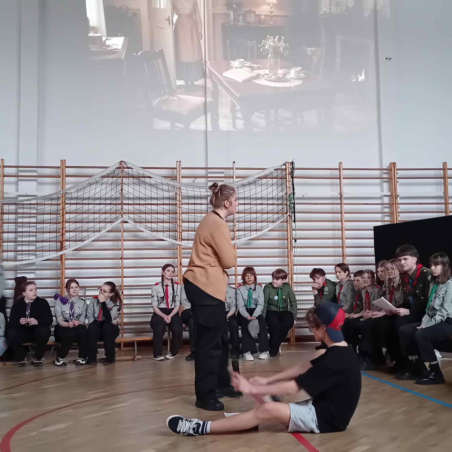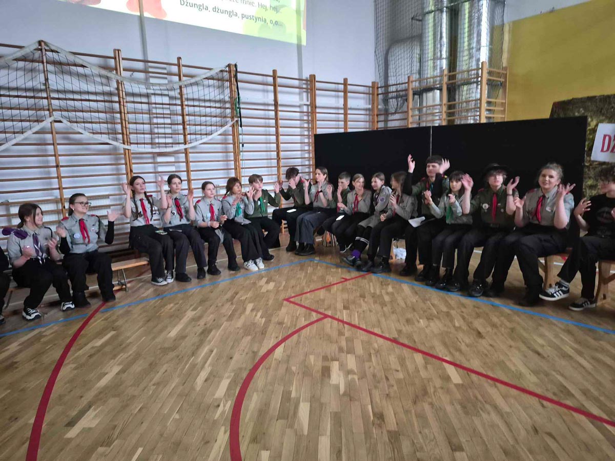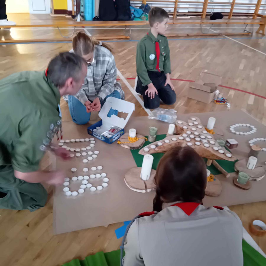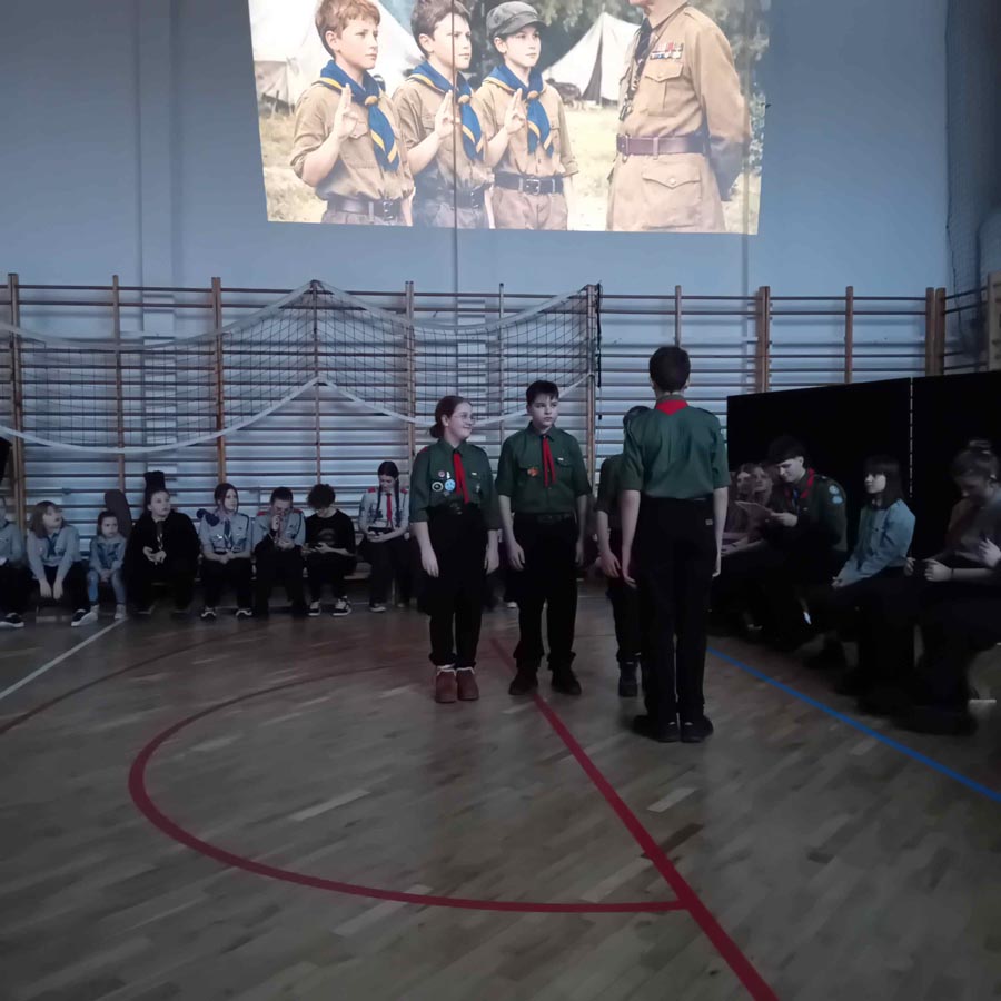 Kolejnym punktem uroczystości była gra tematyczna integrująca harcerzy z różnych środowisk oraz sprawdzająca ich wiedzę o twórcy skautingu i umiejętności z zakresu pierwszej pomocy, wiązania węzłów… Patrole harcerskie i zuchowe przemierzały szkolne korytarze, realizując zadania na punktach kontrolnych. Na zakończenie, z otrzymanych elementów, układały pamiątkową kartę do kroniki z wizerunkiem „Bi-Pi”. W stołówce czekał na uczestników słodki poczęstunek.