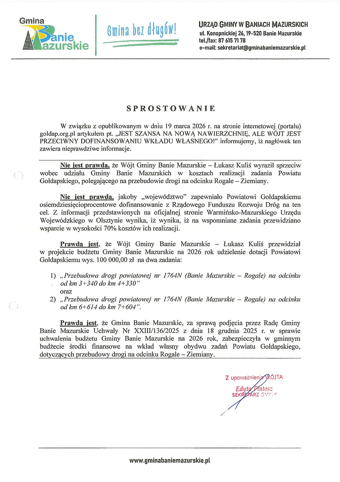 W nawiązaniu do naszego artykułu zatytułownego „Jest szansa na nową nawierzchnię, ale wójt jest przeciwny dofinansowaniu wkładu własnego!”, który ukazał się 19 marca, niżej publikujemy sprostowanie podpisane przez Edytę Płatosz sekretarza Gminy Banie Mazurskie.